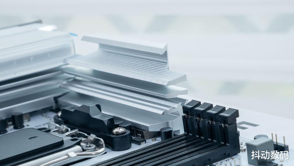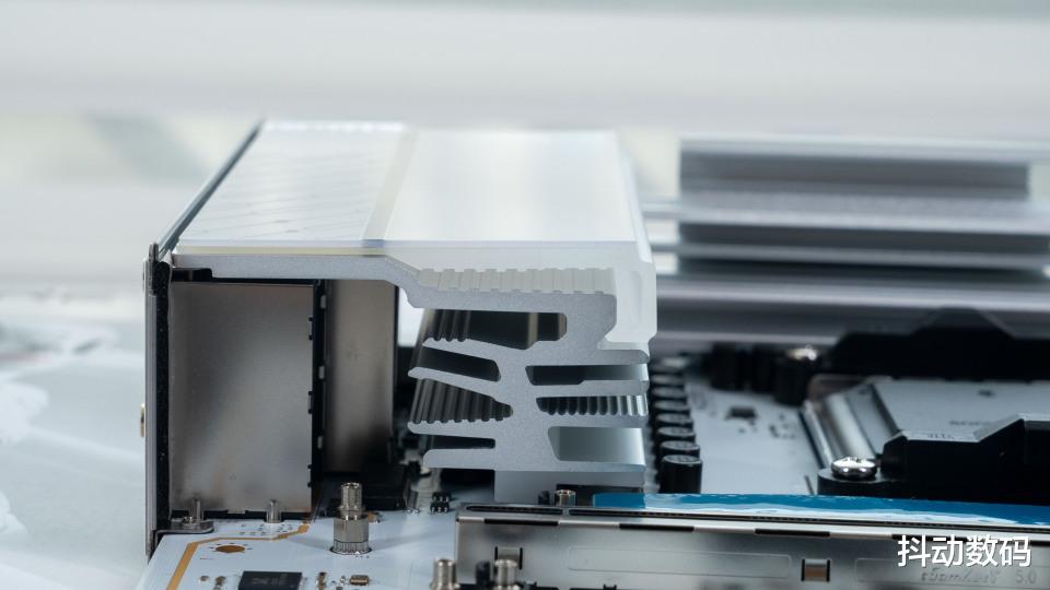 全覆盖式IO一体散热装甲,在IO散热装甲上还加入了半透光的白色塑料装饰板。阶梯式堆叠,视觉上更有立体感,同时避免了大面积纯白的单调感,当然如果还能加入灯光效果就更帅气了。