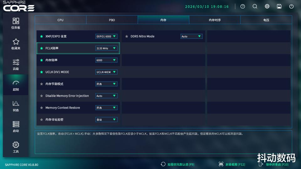 蓝宝石X870A主板的内存超频界面也是非常清爽,把内存常规设置、内存时序设置以及电压设置做了分页处理器,这样看起来真的非常清爽。小白用户在EZ界面一键开启XMP/EXPO即可,而超频玩家则可以在这里实现内存时序的超频设置。