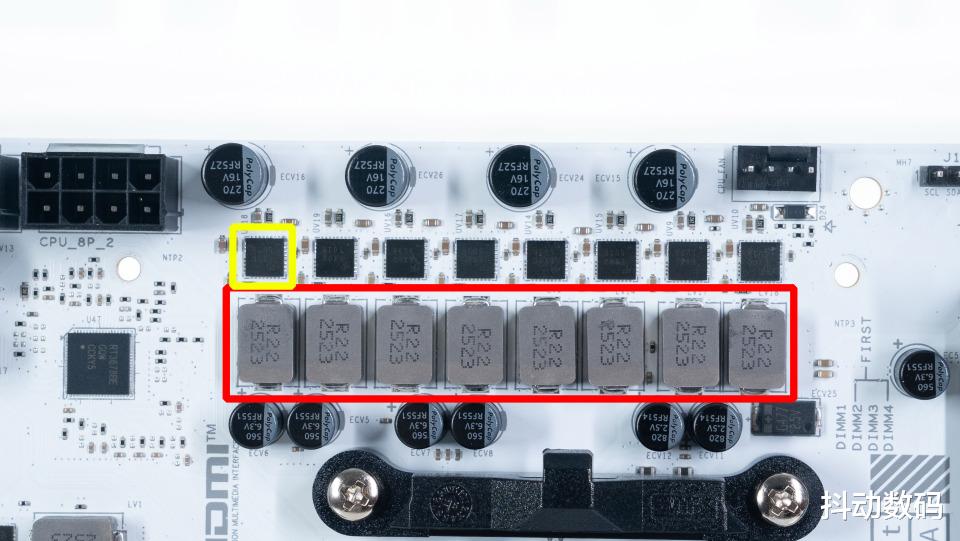 红色方块的电感一侧的黄色方块中的黑色芯片是55A DrMOS,支持最高55A 的电流输出,以满足旗舰锐龙处理器的供电需求。