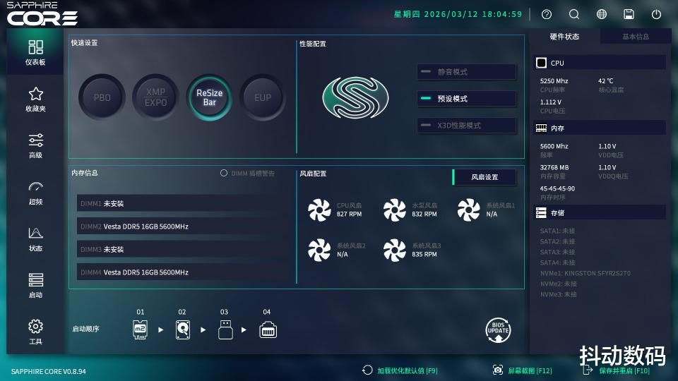不过目前的BIOS界面也足够友好,在首页—仪表板界面中就可以快速通过分块区域对系统进行设置。比如小白玩家可以根据需要在快速设置中一键开启PBO、EXPO、ReSize Bar和EUP功能;在性能配置界面则可以快速调整静音、预设以及性能模式。