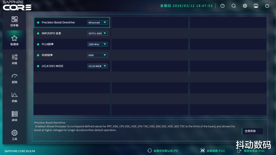 当然对于高阶玩家来说,可以直接进入「超频设置」选项,在这里对CPU、PBO、内存、内存时序、电压等做了分区设置。这样玩家可以直接告别烦琐的BIOS界面,快速跟进设置找到自己需要的功能。