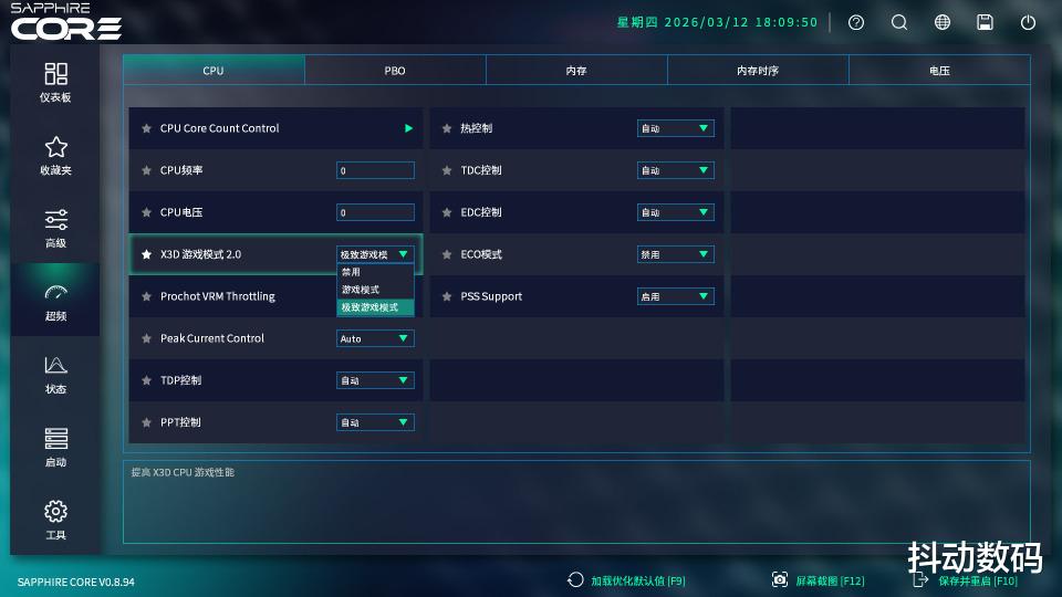 此外这次蓝宝石主板BIOS中还提供了X3D游戏模式,默认为关闭状态。可以选择「游戏模式」以及「极致游戏模式」。开启X3D 游戏模式2.0之后,两个选项都会自动开启AMD PBO,会自动配置PBO+100MHz x8,降压15。