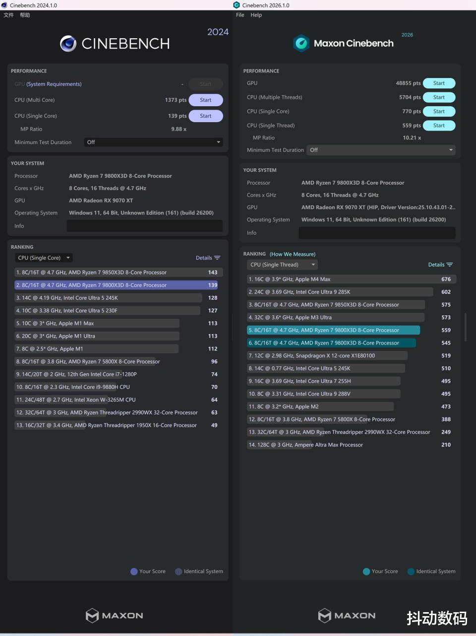 Cinebench 2024与最新的2026版本测试结果如图,可见我这颗9800X3D在手动PBO 2之后收益还是非常明显的。而且即便是搭配风冷,其性能释放在当前的天气下都不会有问题。