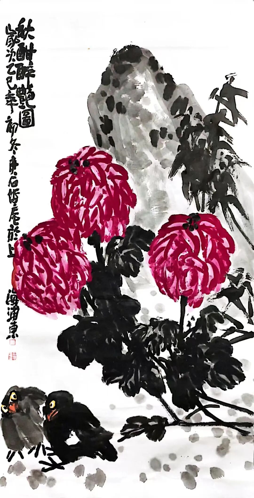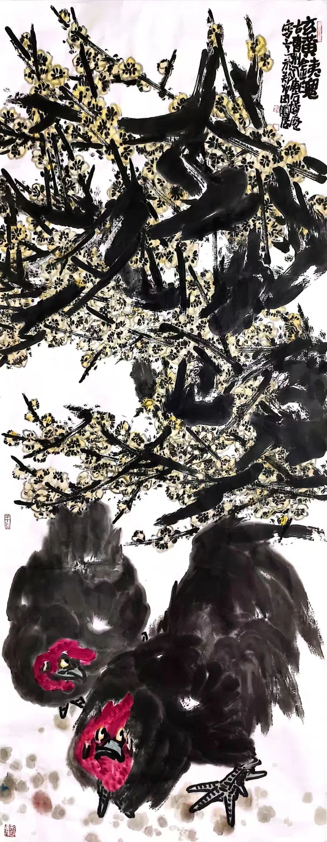 在当代中国大写意花鸟画的版图上,田博庵先生是一位风格卓然、路径独特的创作者。他的画作,初看扑面而来的是一种撼人的“气势”——雄强、朴拙、墨气淋漓,充满金石雕刻般的力度;细品之下,却又能在浓墨重彩与纵横枝干间,寻得一份源自乡野的盎然生机与温情诗意。这种将“金刚杵”的力道与“绕指柔”的情趣熔于一炉的特质,使其艺术在众多追摹古风的写意作品中,显得格外厚重而鲜明。
