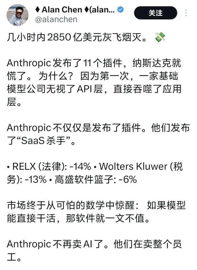 有人在社交媒体上评价:“Anthropic发布了11个插件,纳斯达克就慌了。为什么?因为第一次,一家基础模型公司无视了API层,直接吞噬了应用层。……如果模型能直接干活,那软件就一文不值。”