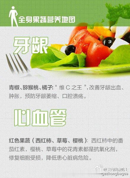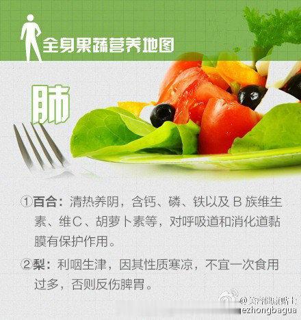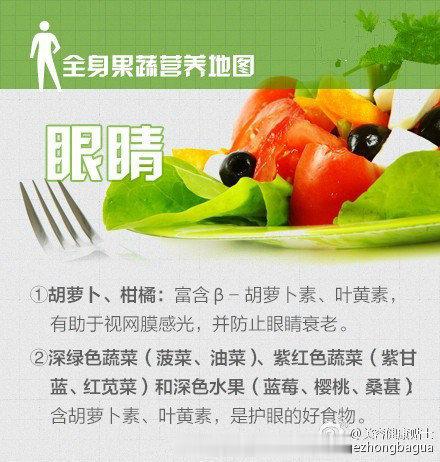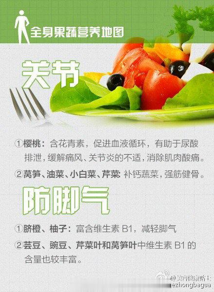 【收藏!全身果蔬营养地图】如果每天盯着电子屏,记得多吃菠菜和蓝莓;如果你经常口腔溃疡、牙龈出血,每天别忘柑橘和猕猴桃;如果被吸入“二手烟”深深困扰,你的菜单一定不能少了百合和雪梨,每种果蔬能量不同,想知道身体各部位最爱的果蔬是什么吗?戳图↓↓↓ 从头到脚帮你赶走“亚健康”!
