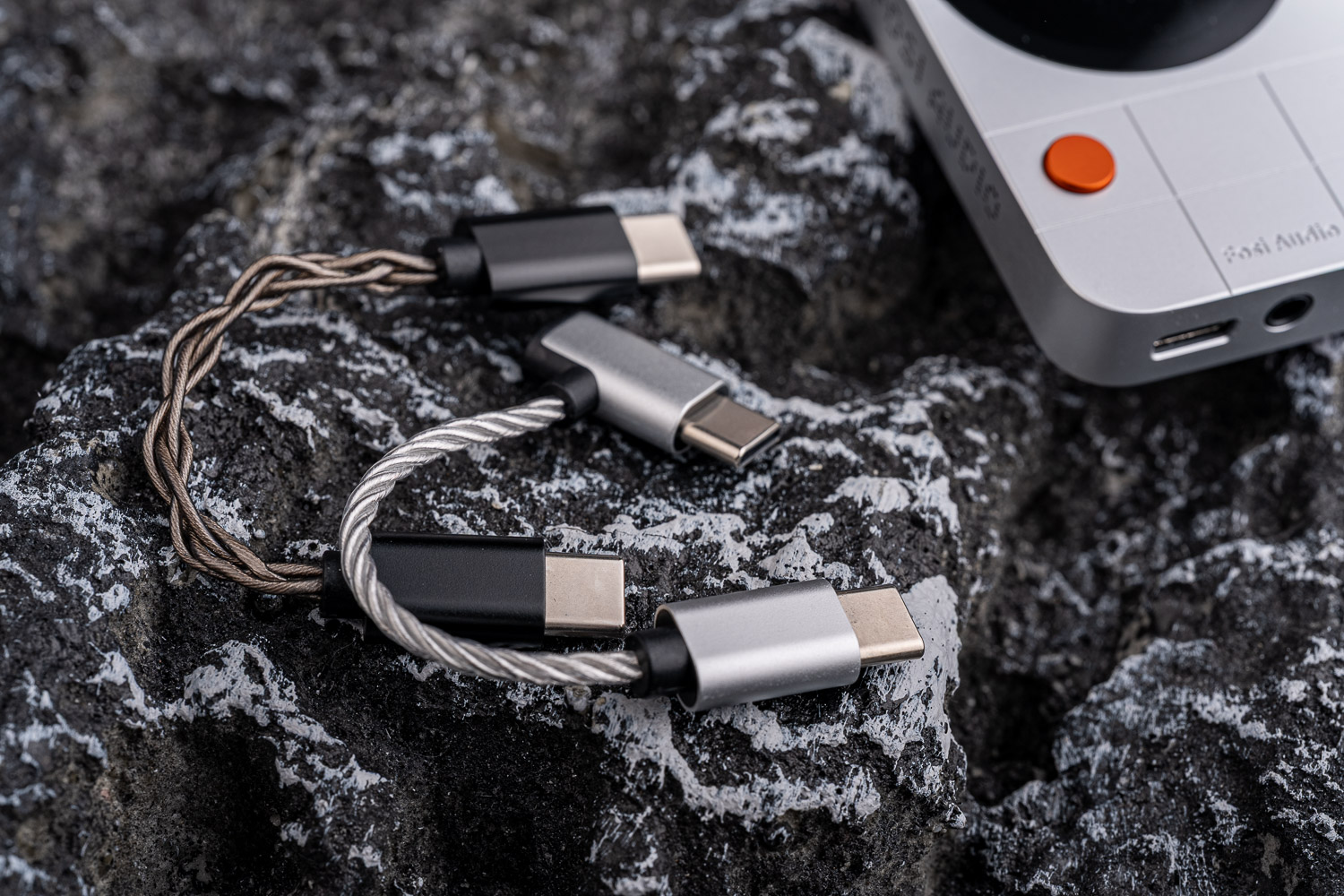 包装内附赠了两根USB线,这当然是给好评的,其中一根是在一端做了L口,而棕色的那根则是直接采用了Fosi自家IM4这副耳塞的5N无氧铜镀银原线做的,但其实耳机线大多数时候并不适合直接用于对录线/数字线,因为结构和屏蔽一般得重新设计,这根线的声音素质并不如那根更细的L头线,但两根线带来了不同的音色变化,给用户多提供一种可玩性还是非常值得鼓励的做法。声音评价的内容我会基于L头的线为主,另一根线的变化下文会做详细说明。
