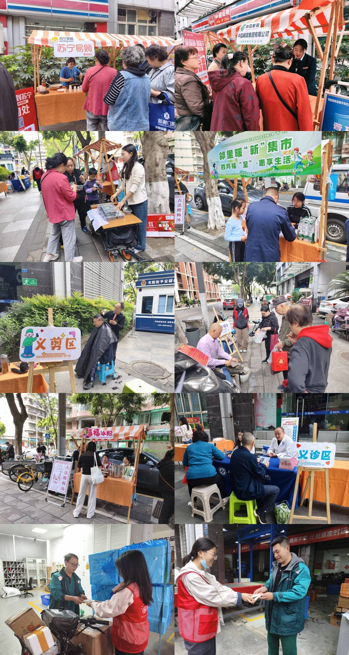 活动现场,苏宁易购春熙路店、中国邮政速递物流股份有限公司成都市锦江分公司、水果摊位带来特色商品展示及专属优惠,五福冰粉提供酸梅汤试饮,让居民在逛集市中享受实惠;志愿者还为奔波忙碌的邮政快递新就业群体送上养生汤包,以贴心关怀致敬一线劳动者。义诊、义剪、磨刀等便民服务摊位前,居民们有序排队、亲切交谈,感受社区大家庭的温暖。