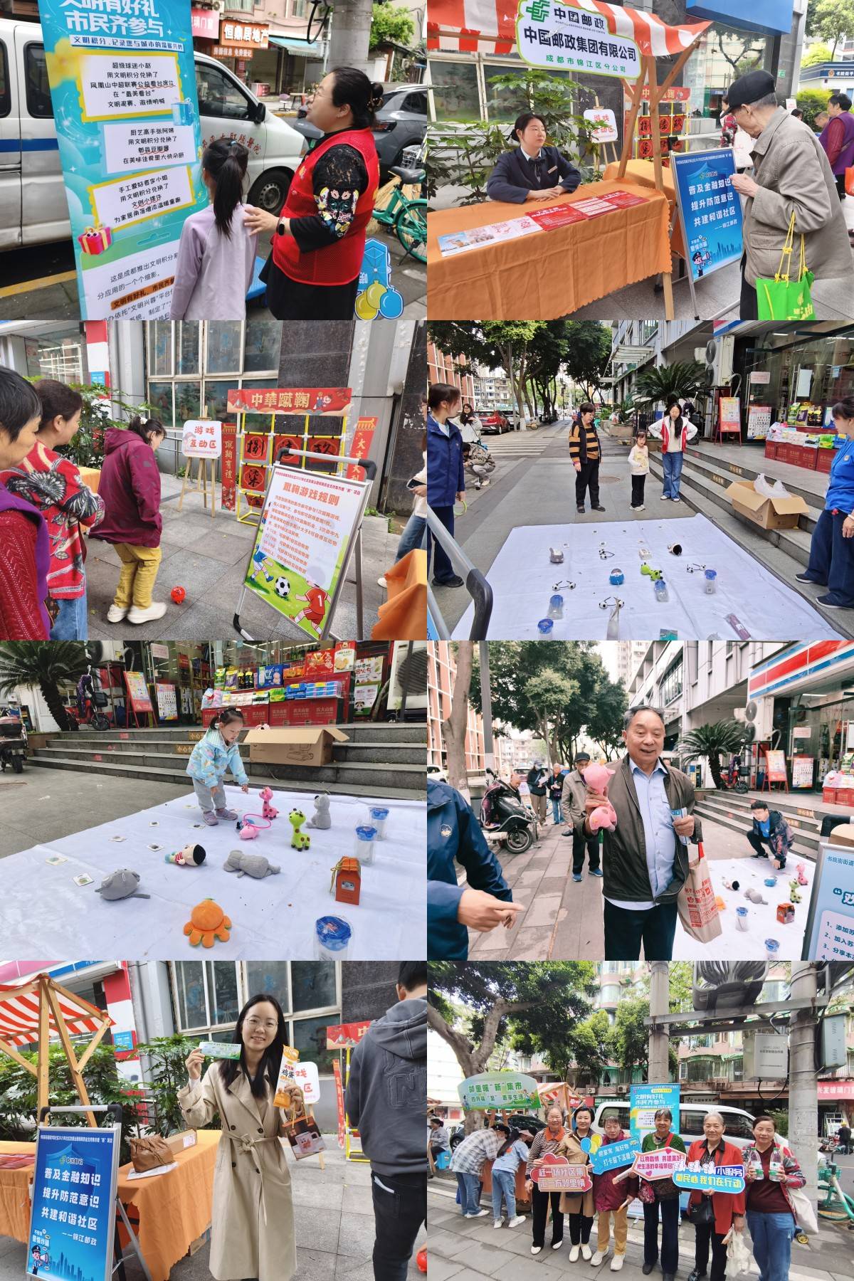 以上照片为文明实践站宣传、防诈宣传、居民参与互动游戏,合照