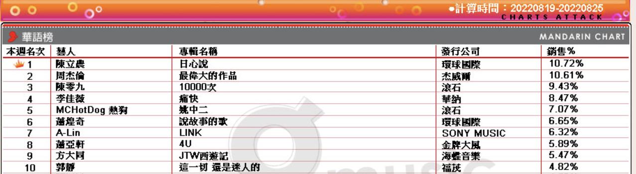 本周看到陈立农的《日心说》上榜,这张专辑的数位版在2021年底就已经发行了,如今上榜的是实体版,两个版本不同步,见怪不怪。赶在2021年底发行数位版,应该是为了金曲奖的报名工作。