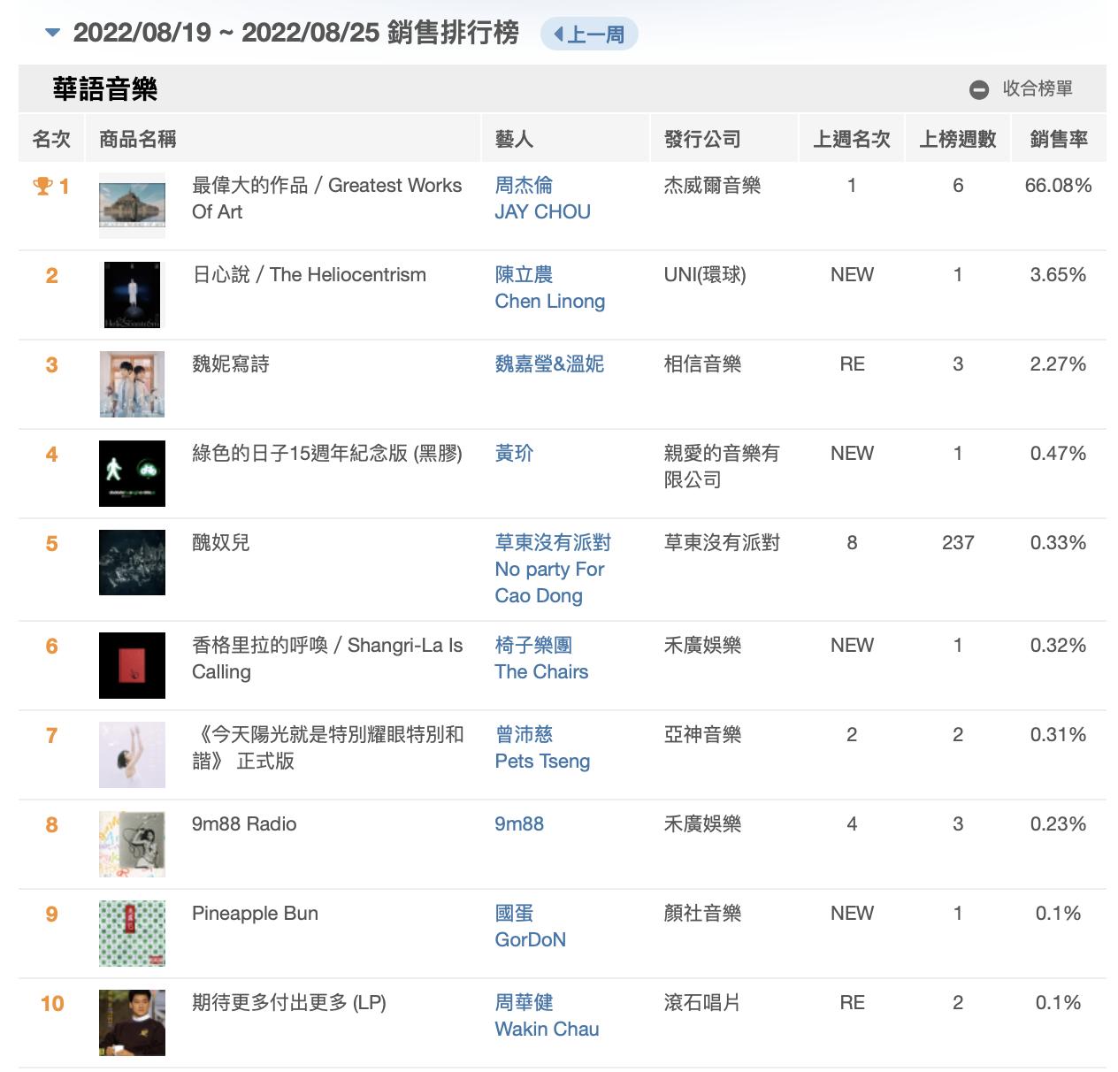 五大唱片2022年第34周榜单,周杰伦《最伟大的作品》六连冠,曾沛慈《今天阳光就是特别耀眼特别和谐》获得亚军,陈立农《日心说》空降季军。