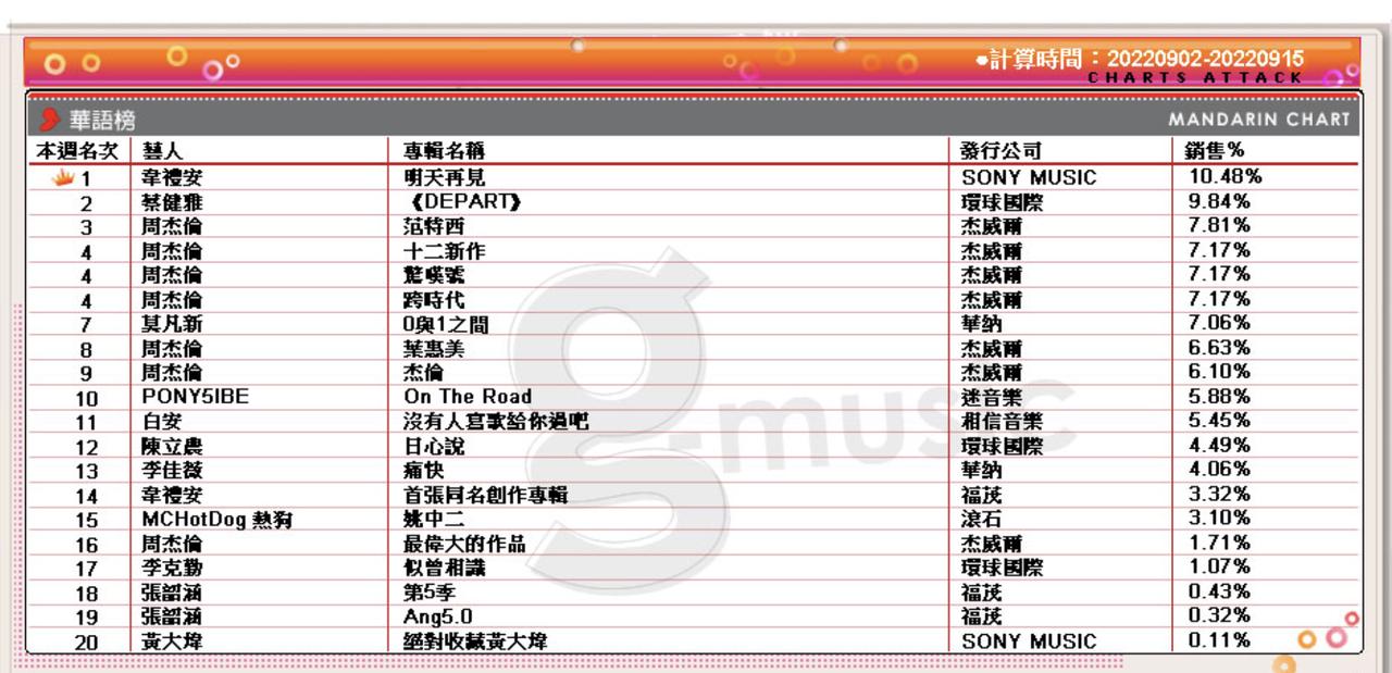 五大唱片2022年第37周榜单,周杰伦《最伟大的作品》蝉联第9周冠军,韦礼安《明天再见》新作上榜夺得亚军,李友廷《冷身操EP》获得季军。