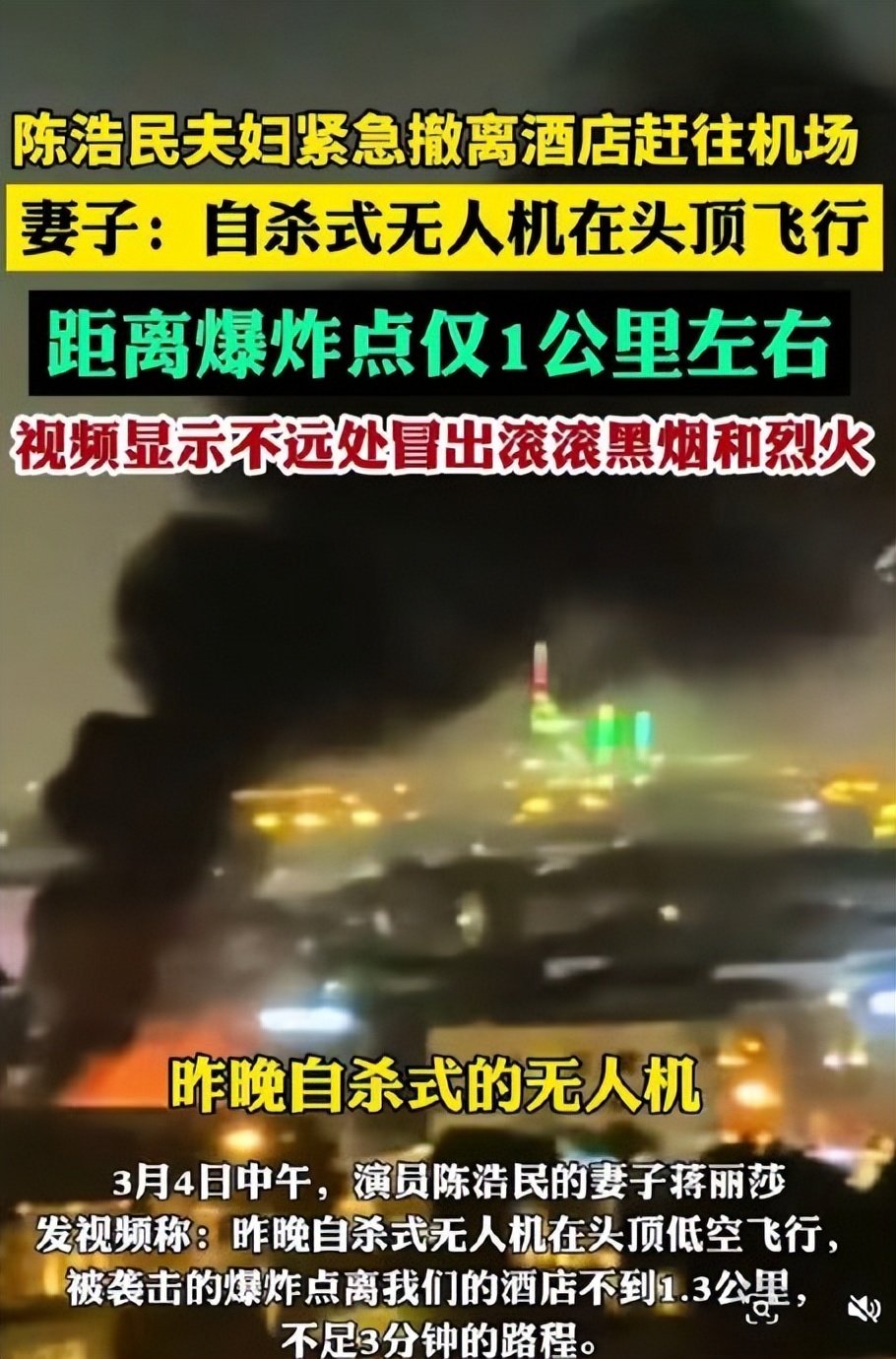 3月3日晚,美国驻迪拜领事馆附近遇袭。蒋丽莎后来发的视频里,窗外不远处冒出滚滚黑烟和烈火,地图显示,他们居住的酒店距离爆炸点仅1.2公里,车程不足3分钟 。