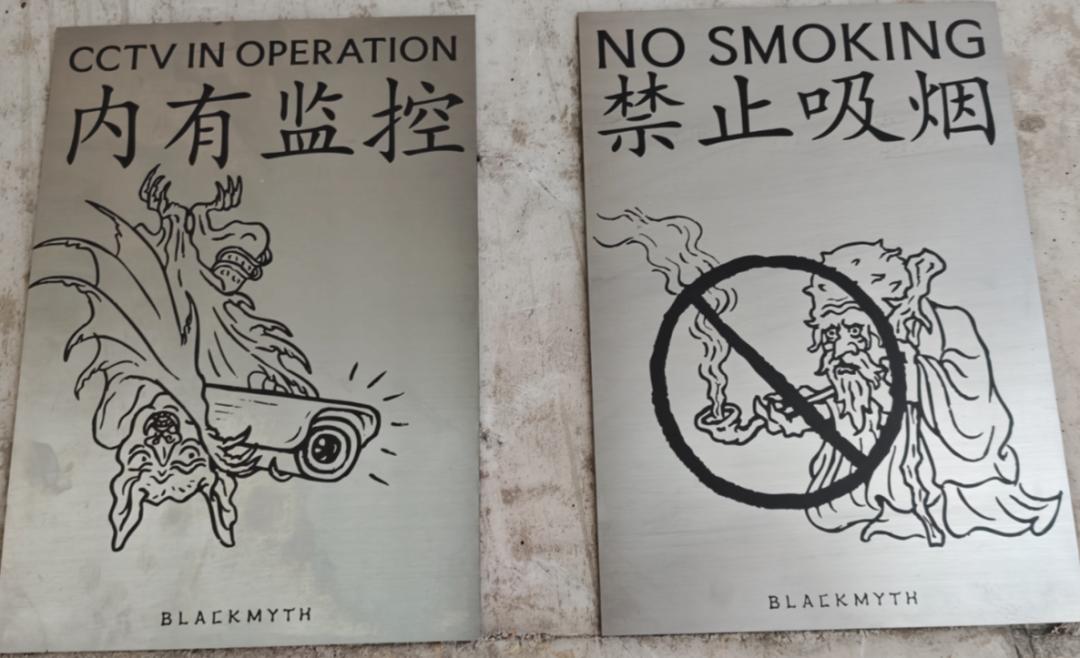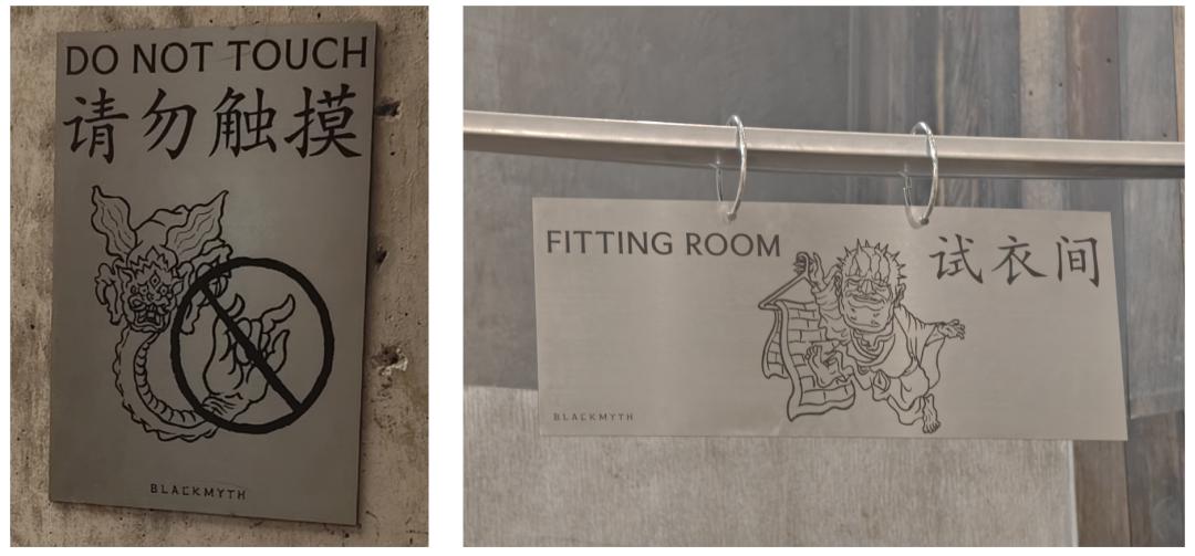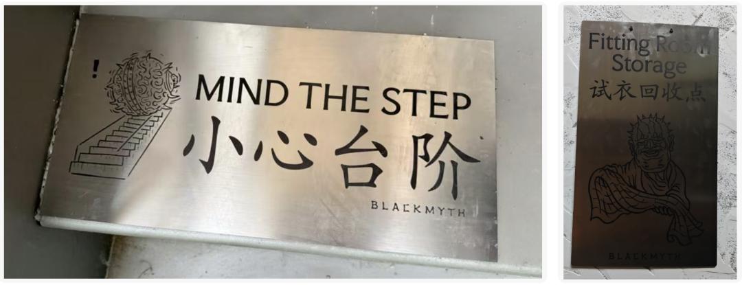 包括整个店面细节里,也有相当多类似的设计思路:小心台阶-铁球机关,试衣间-金池换新衣,禁止吸烟-土地公出去......如果你玩过游戏,就会觉得这些元素的搭配实在是太贴切。