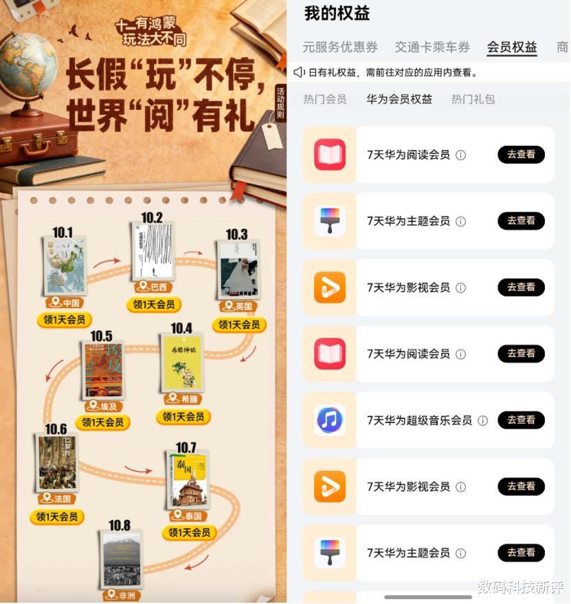 说到这,必须给各位华为手机的兄弟姐妹们安利一个大羊毛!我这个阅读会员就是白嫖的,只要你的手机系统升级到鸿蒙5.1及以上,从桌面右滑到负一屏,就能看到“鸿蒙有礼”的活动入口。每天进去签个到,就有机会领7天华为阅读会员,可以一直叠加!运气爆棚还能抽到Petal One大礼包,里面直接含3个月会员,国庆假期妥妥够用了!升级了系统的同学,国庆假期每日在华为阅读内打开“十一有鸿蒙,玩法大不同”活动页,还可领取1日阅读会员,解锁专属书库畅读会员好书。