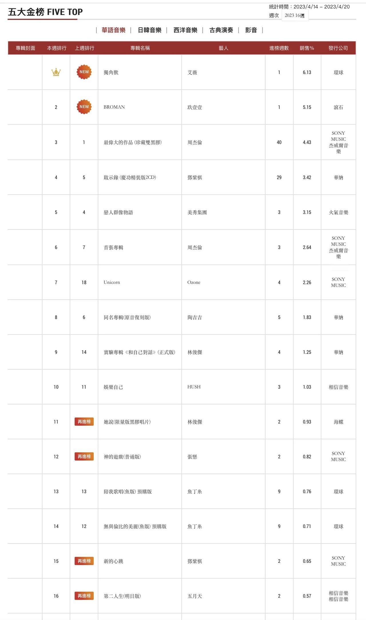五大唱片榜2023年第16周榜单,艾薇《独角兽》空降冠军,玖壹壹《BROMAN》获得亚军,周杰伦《最伟大的作品》获得季军。