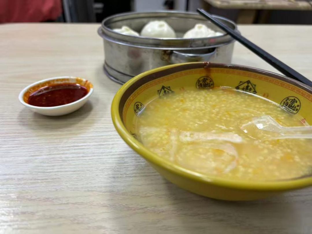 包子一笼八个,不管肉的瘦的都是十块,稀饭一碗三块,价格自然不能说实惠,但也还算可以接受,毕竟是在火车站跟前嘛。