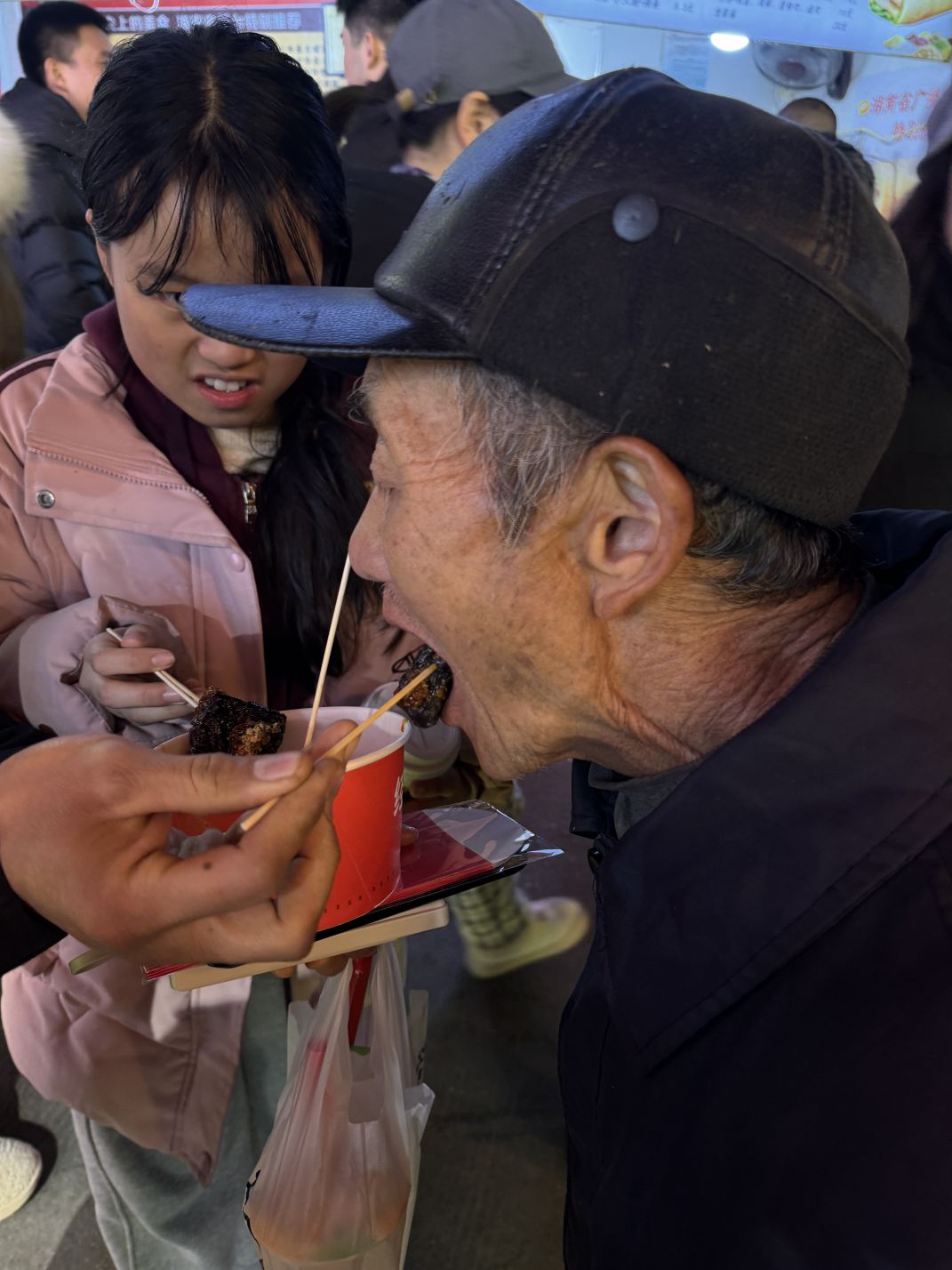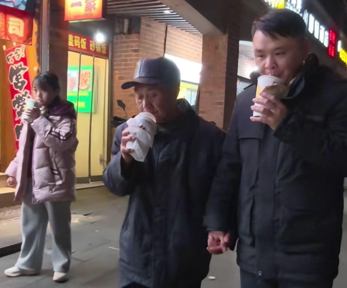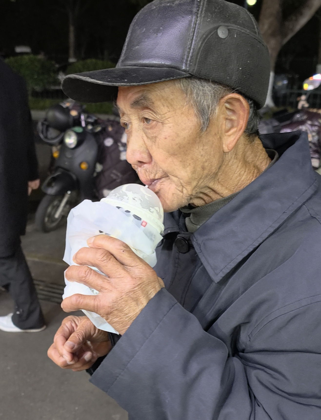 在长沙游览时,周朝阳要给父亲买一杯“茶颜悦色”奶茶。父亲像往常一样,连连摇手,说“不要,不要”。周朝阳想着出来旅游一次不容易,还是给父亲买了一杯热奶茶。父亲接过,喝了几口,周朝阳问:“好不好喝?”父亲点头:“好喝,好喝。”吸管很细,父亲吸不上来,说没了。周朝阳帮父亲把奶茶盖打开,父亲像喝茶一样,把剩下的奶茶一饮而尽,一点都没剩。