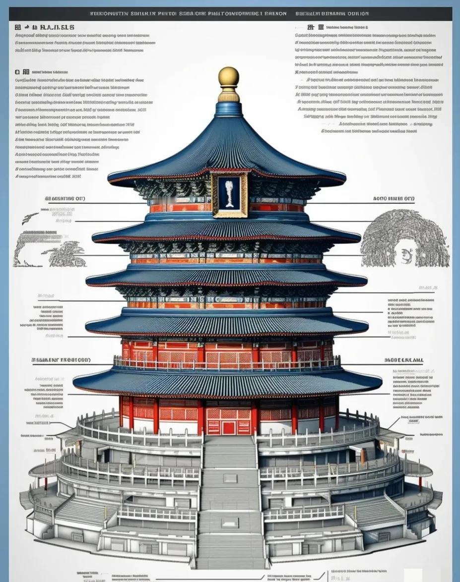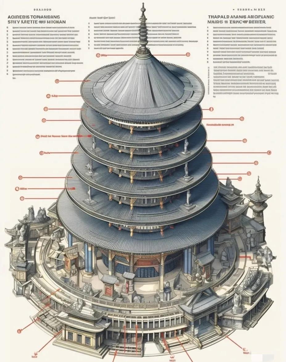基于天坛的一些想象。 天坛是位于中国北京市的一座古代宗教建筑群,也是中国古代建筑艺术的杰出代表之一。它始建于明朝永乐年间(公元1406年),是明清两代皇帝祭祀天地的场所,也是世界上现存最大、最完整的古代祭天建筑群之一。 天坛占地面积约273万平方米,主要由三个部分组成:祈年殿、皇乾殿和園丘坛。其中,園丘坛是天坛的核心,是一个直径为36米的圆形坛台,高约6米,周围围以环廊和围墙。皇帝在此举行祭天仪式时,会在圆丘坛上焚香祭祀天地,祈求丰收吉祥。 天坛的建筑采用了许多古代中国建筑的典型特点,如对称、规矩、整洁等,展现了中国古代文化的博大精深。