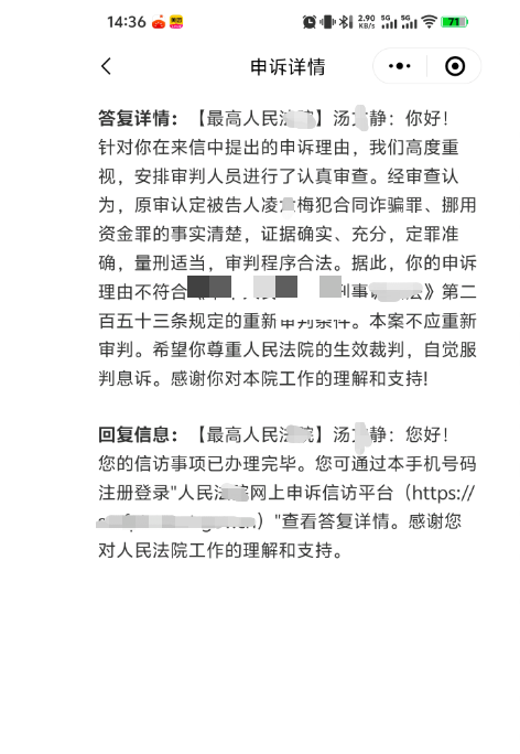 案件进展:申诉之路坎坷 司法公正引期待目前,凌六梅方已向相关法院提交申诉材料申请抗诉,尽管相关法院已接收材料并开展审查,于 2025 年针对申诉作出答复,认为原审裁判事实清楚、证据充分,定罪准确、量刑适当,审判程序合法,不符合重新审判条件。但凌六梅坚持认为,民事再审判决已明确推翻刑事裁判的核心事实依据,案件存在“刑民冲突”,刑事裁判认定的 “诈骗” 基础已不存在,应启动再审程序纠正错误。