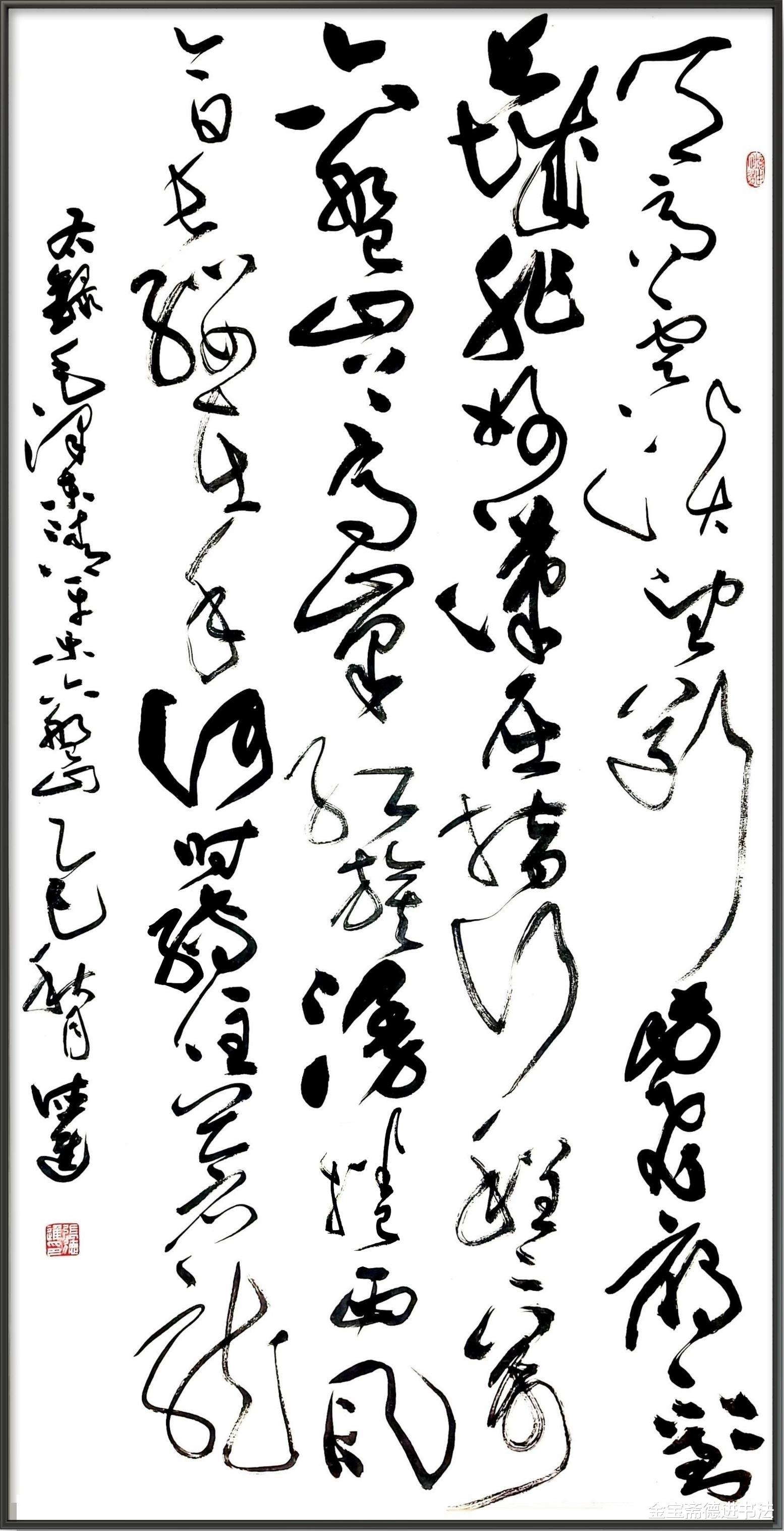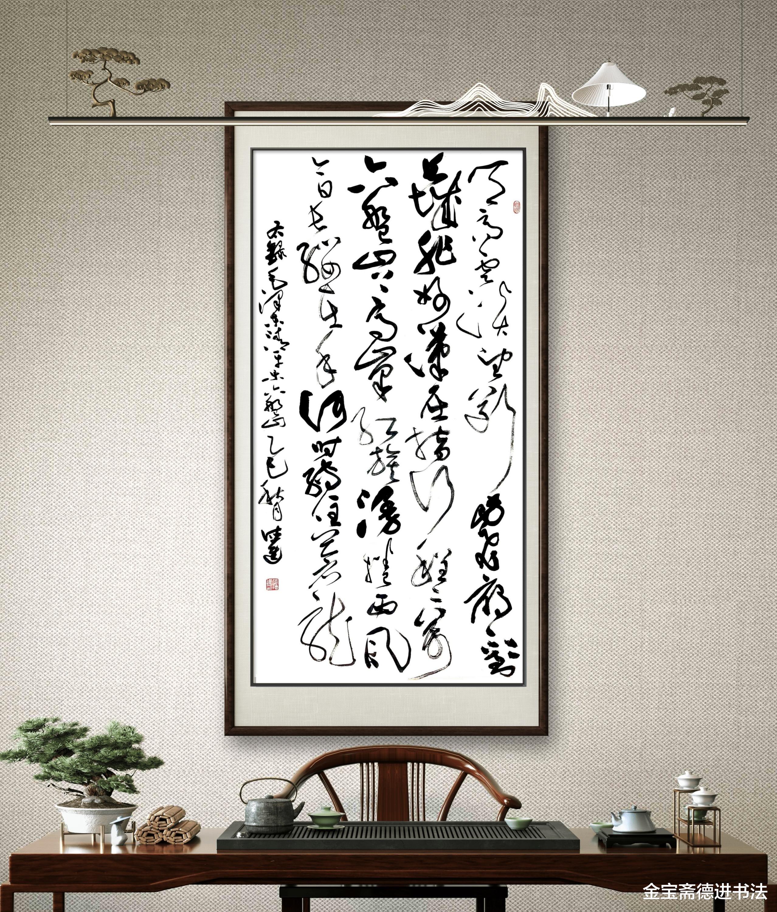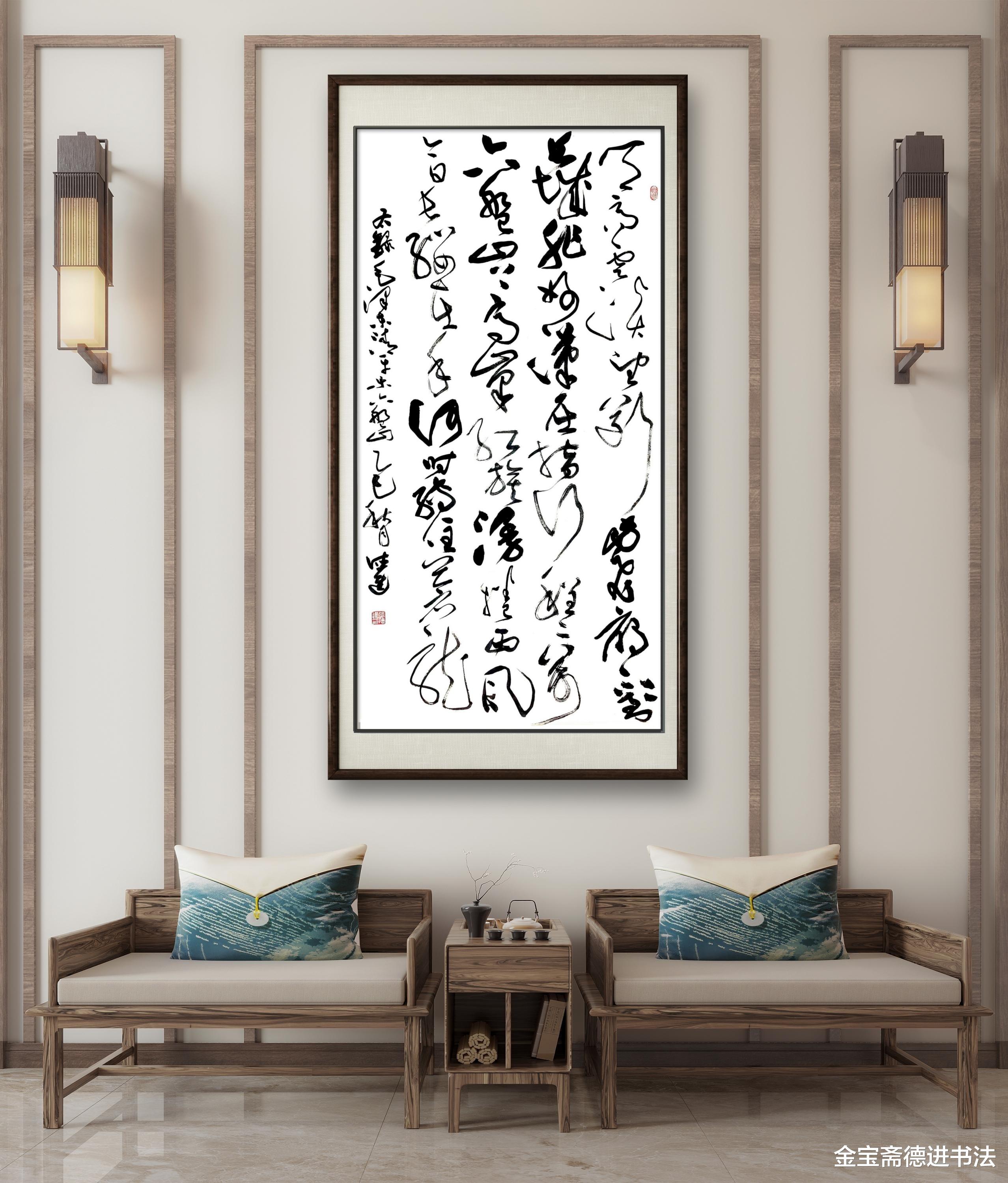 整幅中堂以墨色为纲,淡墨起兴、重墨聚气、轻墨收尾,疏密对比间藏着章法玄机。笔墨的浓淡转换,既是对诗词意境的精准诠释,也是草书艺术 “力与美” 的完美呈现,让观者在笔墨流转中,既感受到书法艺术的韵律之美,更体悟到 “不到长城非好汉” 的豪迈气魄与山河壮阔。