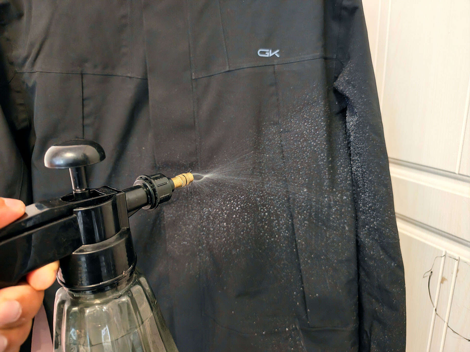 防水是每一款冲锋衣都应该达到的必备技能,所以我在拿到Gakior的第一件事,就是来测试下防水效果,找了高压喷壶进行喷撒,衣服表面竟然是可以挂珠的,不过通常冲锋衣大面积都问题不大,于是我又开始将目光对准了接缝,拉链处,结果也是令我感到满意,在对着接缝处狂喷之后,水流顺着布料滑落,而内里居然一点没湿,这效果非常满意。