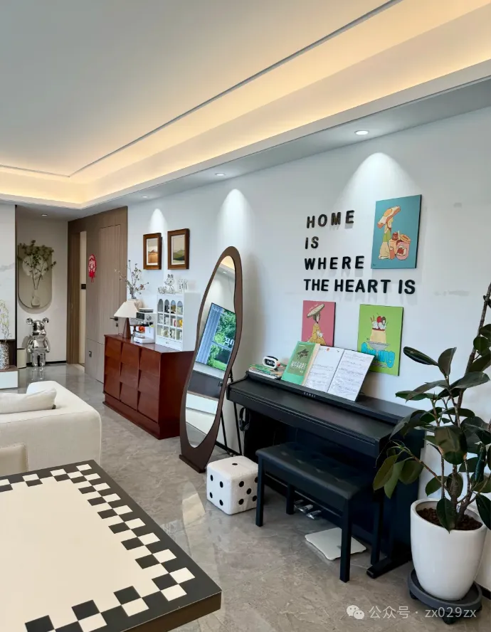 横厅过道太过于浪费了;布局了钢琴和斗柜,斗柜上方咖啡机以及各种小摆件,家一下子有了氛围感。「从杂乱到高效!我是如何把横厅的长过道变成‘黄金区’的,超实用改造全分享」