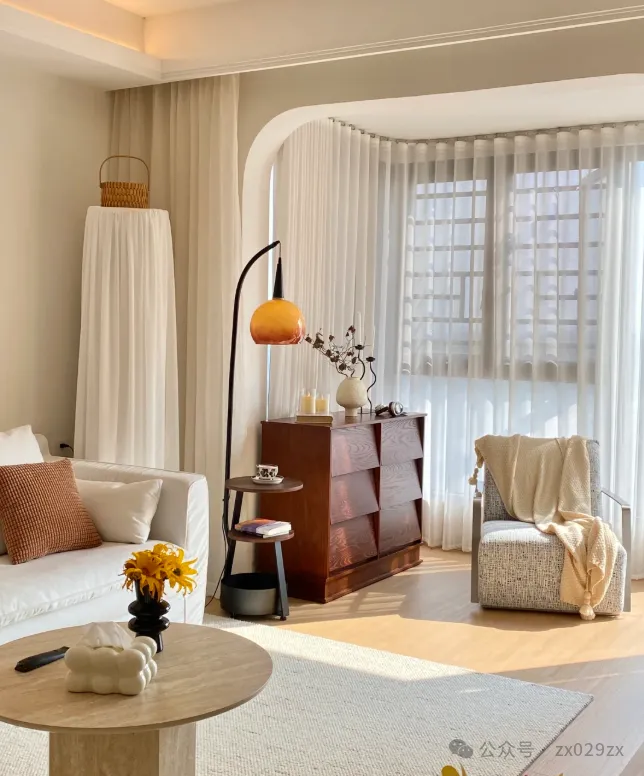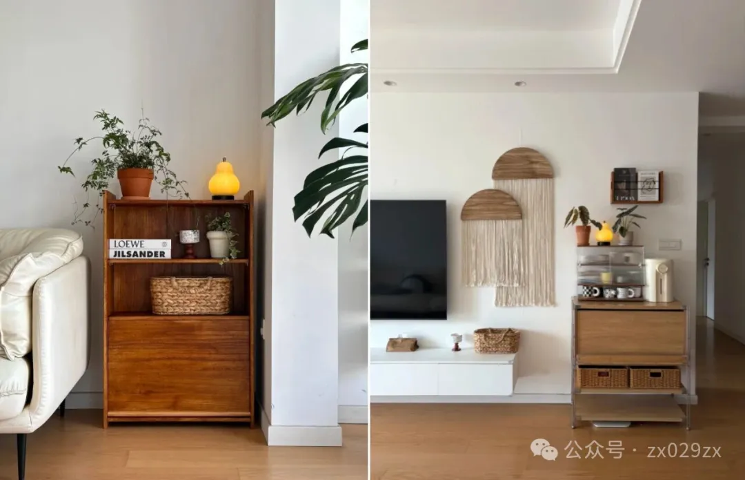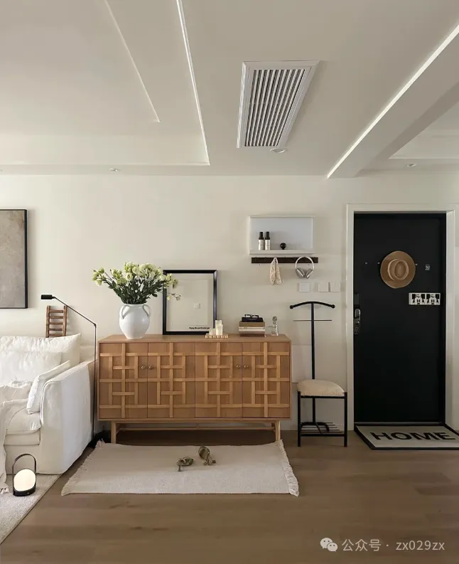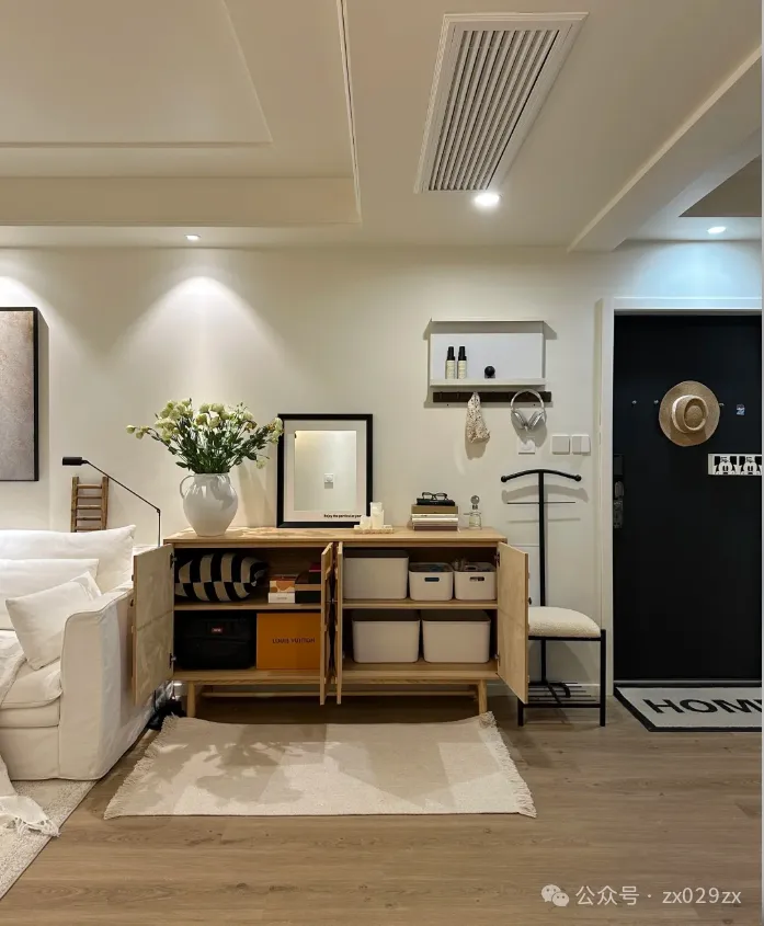 开门见厅户型,还好入户门外满足了鞋柜;沙发布局以后剩余空间布局原木色斗柜,兼顾客厅杂物收纳;挂画以及花瓶可以让斗柜锦上添花。