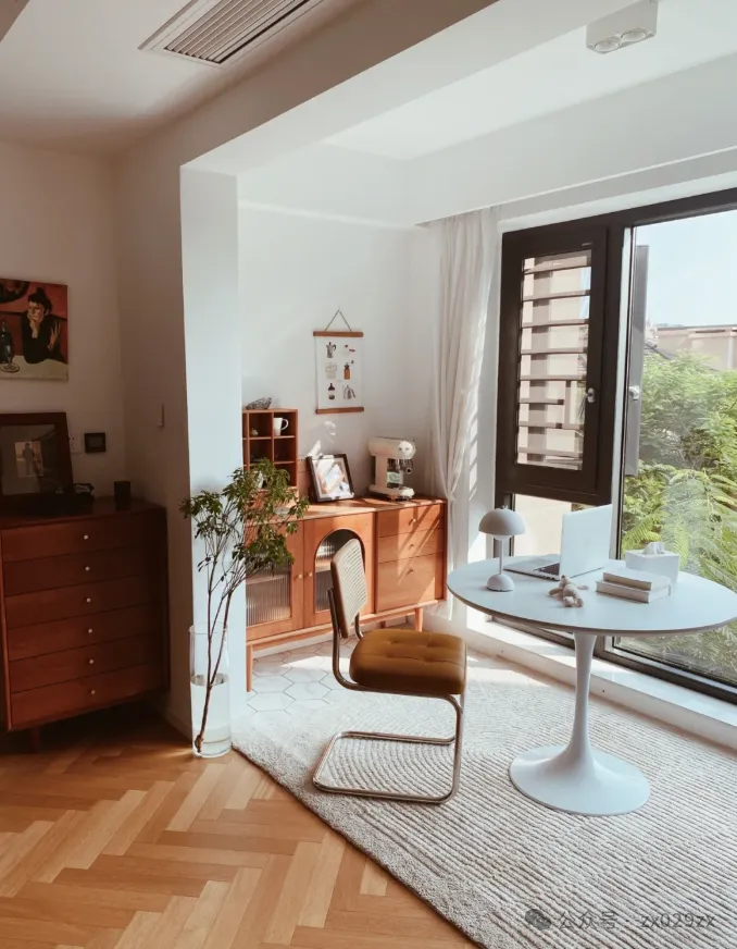 阳台斗柜咖啡角,圆桌满足休闲和办公,惬意人生不过如此。「很意外,阳台放个斗柜更有颜值」