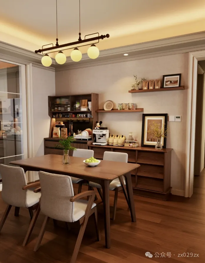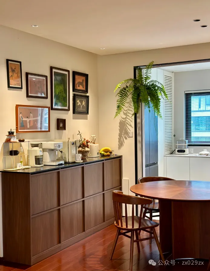 餐厅小也不需要太多收纳,结果入了一个骨骼线斗柜,台面充当水吧台,柜内满足杂物;上方复古组合挂画营造氛围,一下子成了餐厅的亮点。