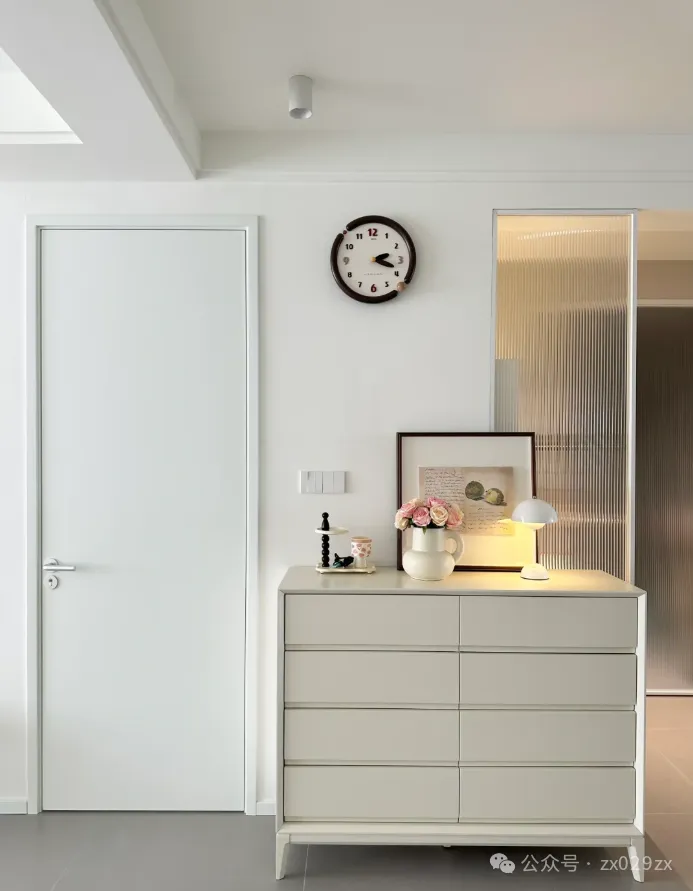 进门直对卫生间,做了玻璃隔断遮挡一下,然后一个奶油色斗柜布局,刚好作为进门的玄关柜功能,放上摆件装饰,立马有了氛围感和温馨感。
