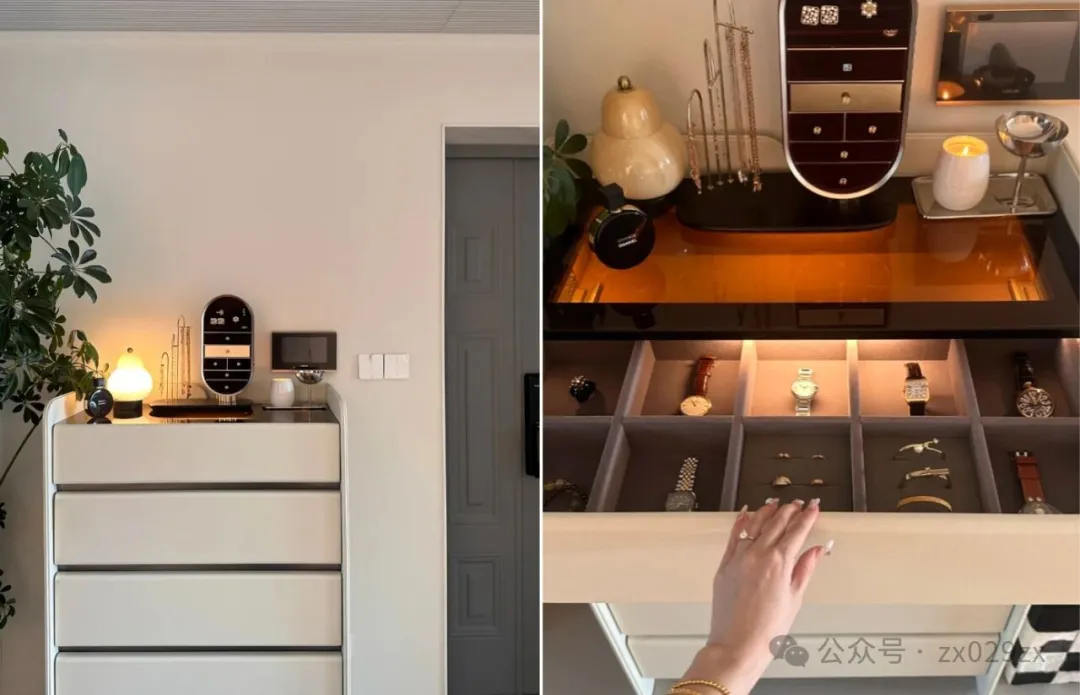 门口有空间刚好满足一个斗柜布局,可以满足进门随手置物;内部专门放置出门要带的各种首饰手表,回来也能方便收纳,颜值还高,成了进门的亮点。