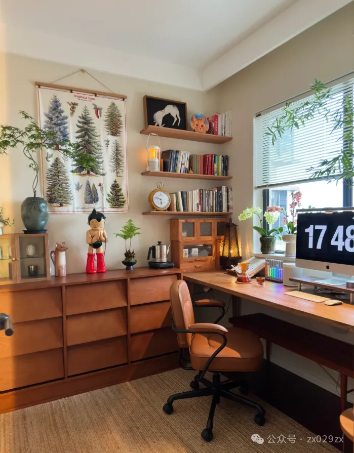 斗柜与书桌L型布局,半包围更适合静静办公和学习;满足强大收纳的同时,各种摆件装饰让书房非常温馨自然