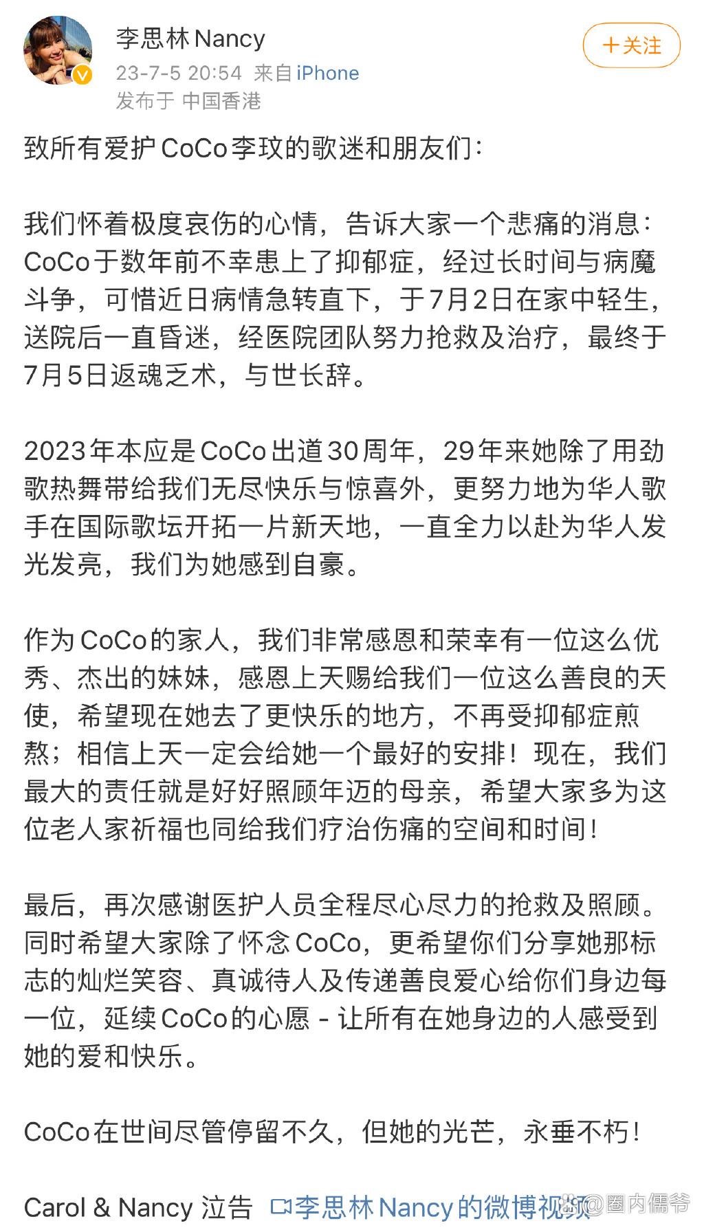 也就在7月5日“华纳音乐北京”也发文称:“所有人此时都怀着无比悲痛的心情,得知我们的微笑天使CoCo李玟7月5日因为抑郁症离开了大家。李玟自1994年出道以来一直享有辉煌的音乐生涯,她是华人的骄傲,她的履历一直被所有人深深记着。CoCo 不仅将东方音乐和文化之美带到全球观众的视线中,并且用歌声、舞蹈以及正能量让大家感受到她希望带给大家的力量。虽然CoCo离开了,但希望她的爱和光芒永远照耀着我们每一个人"。