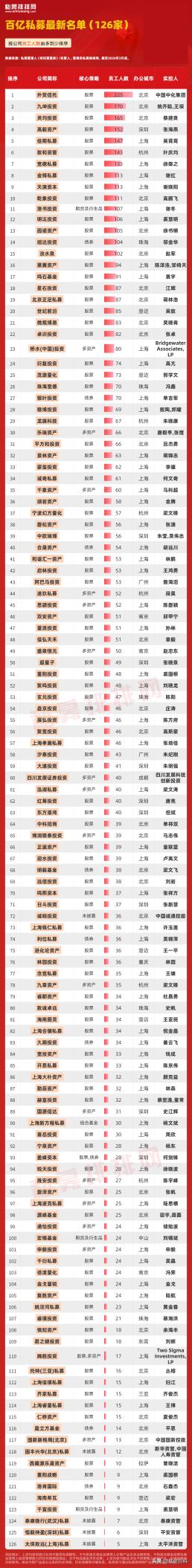 从员工人数来看,有100人以上的百亿私募达15家。其中,外贸信托、灵均投资、高毅资产、佳期私募、敦和资管、金锝私募、乾象投资、洛书投资、因诺资产、纽达投资等机构在百亿私募名单中表现亮眼,完整榜单详见↓↓↓