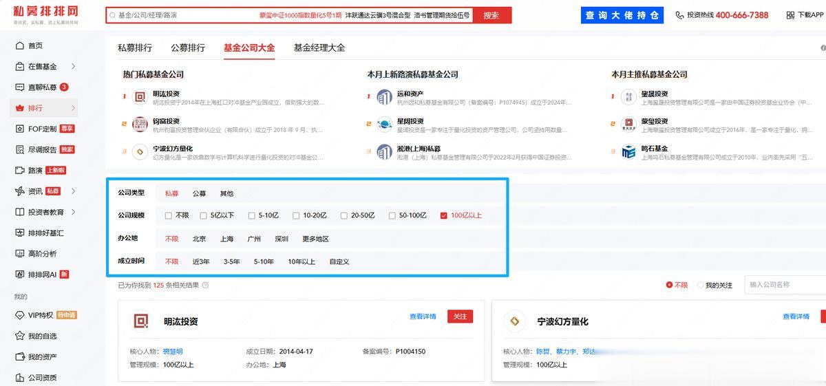 百亿私募名单在哪查?想要查询完整版百亿私募名单;或者从办公地、成立时间、公司规模等更多维度查看私募基金公司一览表,可以用私募排排网推出的基金公司大全栏目。