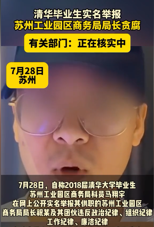 事件缘由据马某某视频阐述,马某某是2018届清华大学毕业生,目前是苏州工业园区商务局的一名科员,指控苏州工业园区商务局局长祝某在政府采购中存在围标、串标和虚设资金等严重问题,并向省委巡视组提供虚假材料,同时还涉嫌学历造假。此前,自己于2023年3月13日曾向苏州纪委监委提交材料,案件也被受理,但1年多过去了,至今没有收到反馈。