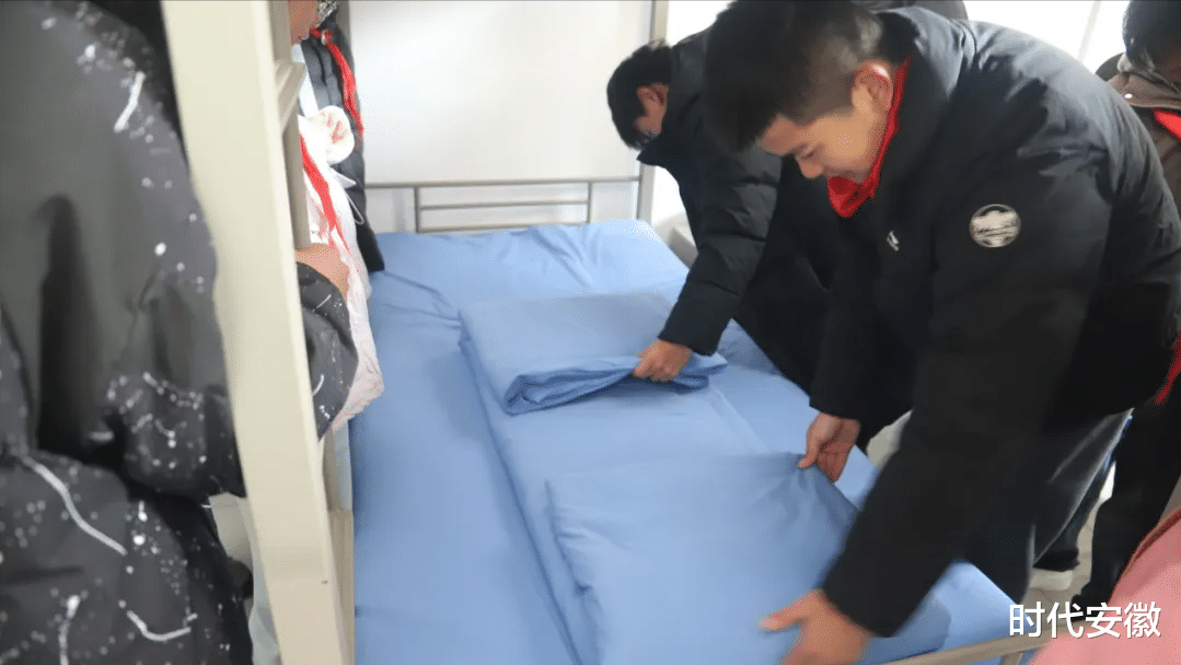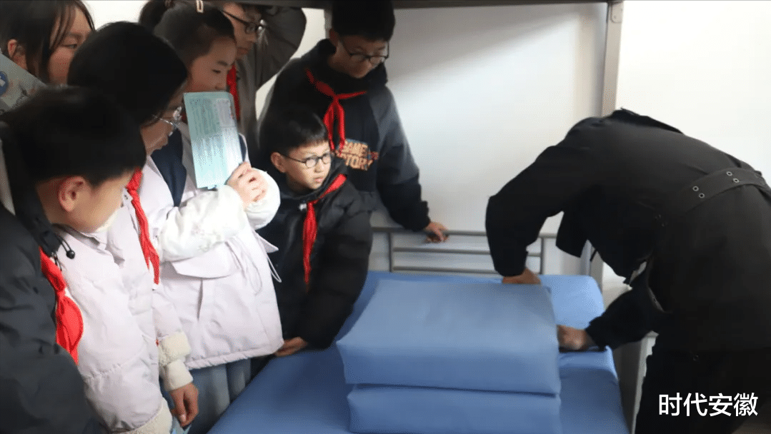 师生们还走进特巡警队员的班排宿舍参观。宿舍内物品摆放整齐划一,棱角分明的“豆腐块”被子、干净整洁的桌面地面,让同学们直观感受到纪律部队的严谨作风与优良习惯。不少同学还在队员的指导下亲手尝试叠“豆腐块”被子,在实践中体会规范与自律的重要性。