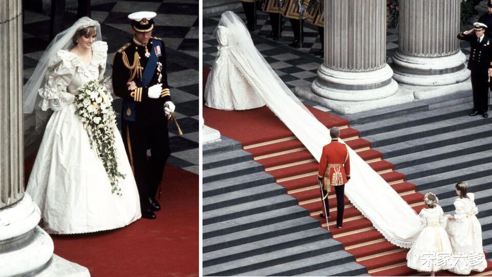 戴安娜王妃那件华丽的婚纱由丝绸塔夫绸制成,宽大的袖子搭配近四米长的裙裾,上面精心饰有手工刺绣、珍珠和水钻,成为历史上最著名的服装之一。