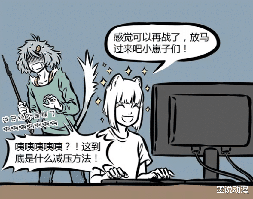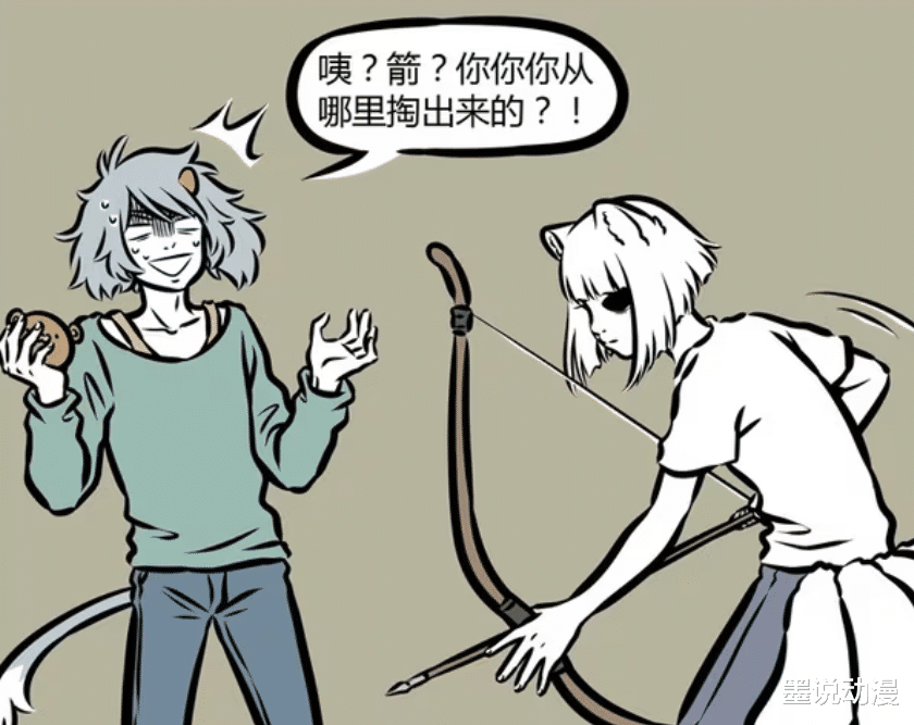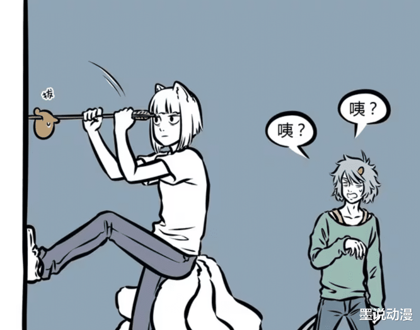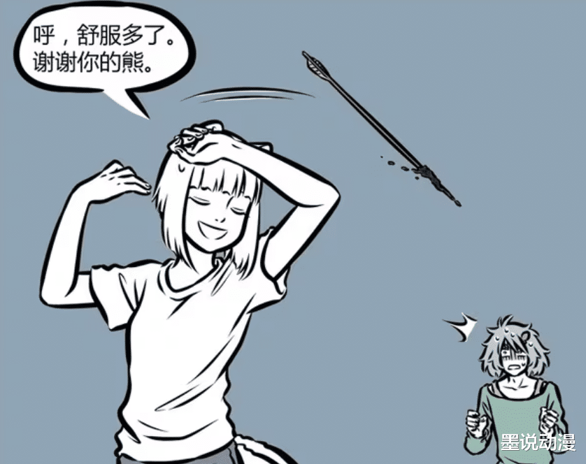 《非人哉》漫画版中,神仙精怪要上班,也会有压力。九月虽然没有什么拼劲,但事实面对客户的时候,偶尔也会压力巨大。这时候就需要解压,那么她会如何解压?哮天提供解压小熊,九月凭空召唤弓箭,用箭射穿解压小熊,随后还劈柴烧火,将解压小熊烧掉。这么一来,九月的压力是解除了,哮天就emo了。