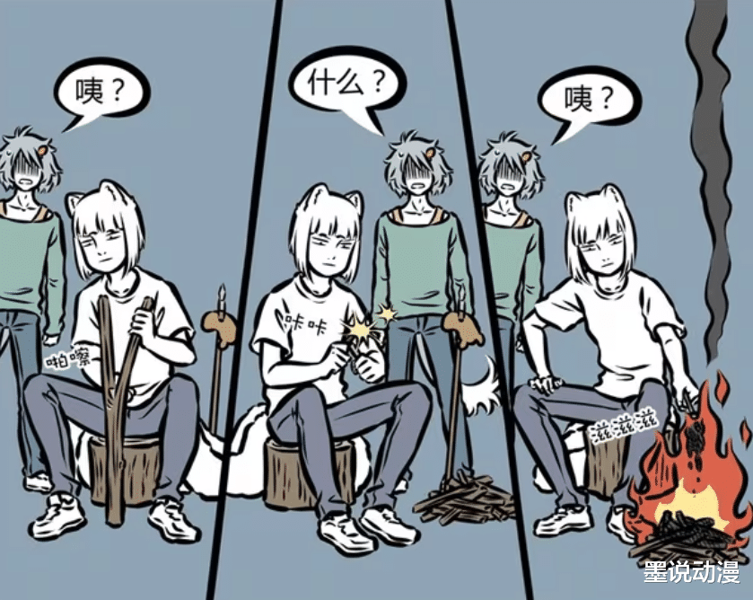 接下来九月的操作,让哮天更加疑惑。九月不知道哪里找来木桩、柴火和小刀。那是坐着劈柴、用打火石点火。柴火点着之后,九月还将解压小熊放在上面烤。哮天看到这一系列操作,那是不知道该说什么?