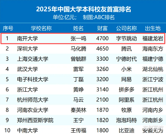 人才培养是高校的第一职责,很多时候看到学校的知名校友,也不由会感慨一句不愧是这所学校培养出来的学生。这不仅是对人才的肯定,也是对于学校人才培养模式的肯定。近期ABC排行公布的2025年中国大学本科校友首富排名,引起了不少关注,排在第一的便是南开大学的校友——张一鸣。这位字节跳动的创始人在数字经济时代开辟了全新的产业赛道,而其成长轨迹与南开大学的教育土壤之间,似乎存在着某种值得深思的关联。