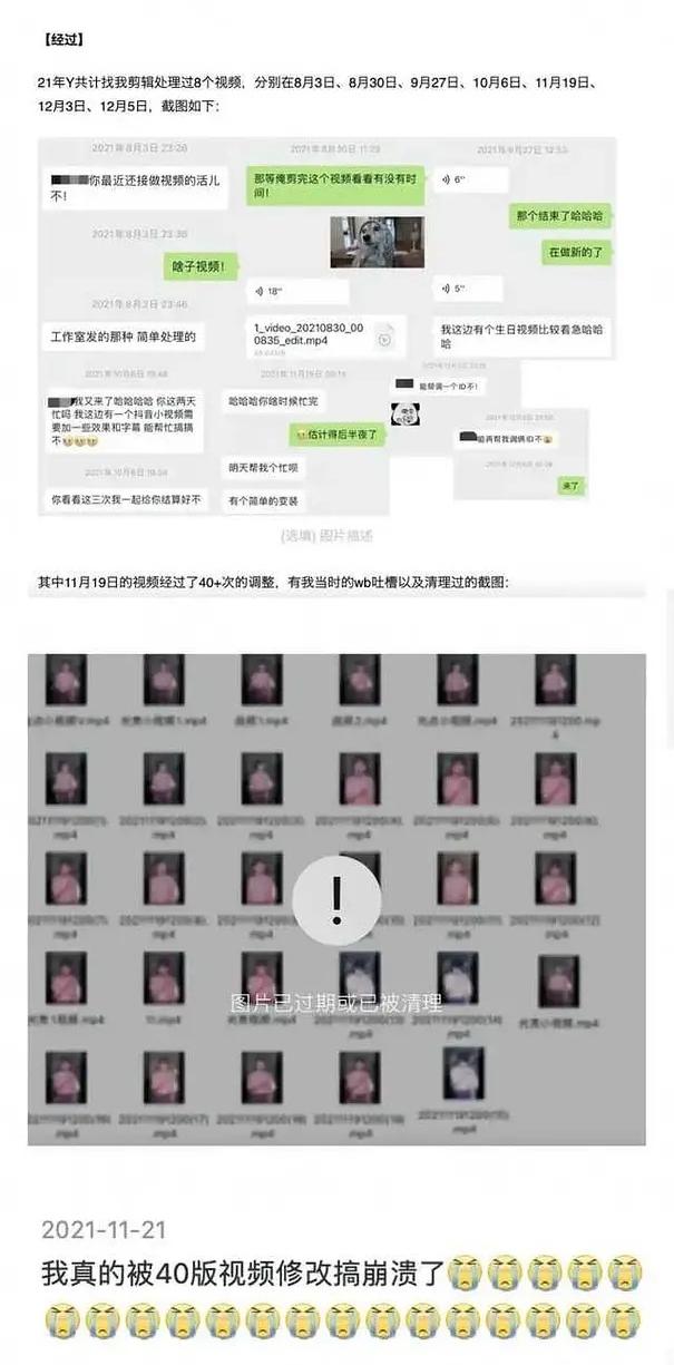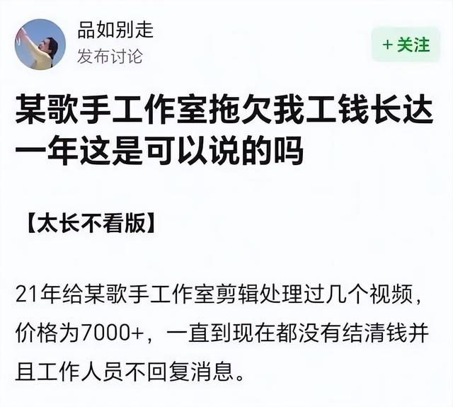 5月19日,有网友发帖爆料为自己维权,内容提到自己曾在2021年给某歌手工作室剪辑视频,前后剪辑了8个视频,报价为7000多元,结果这笔钱到现在都没有结清。