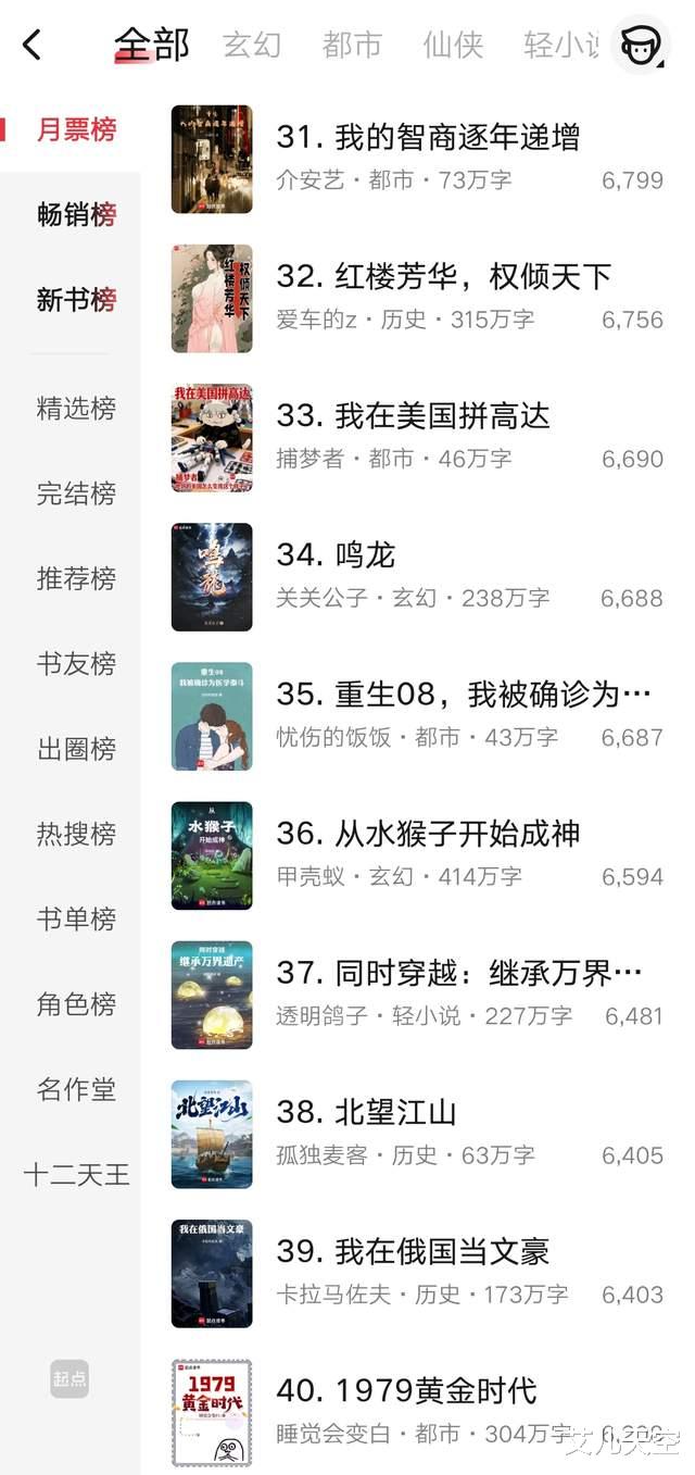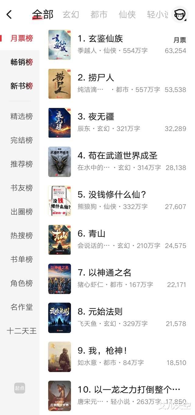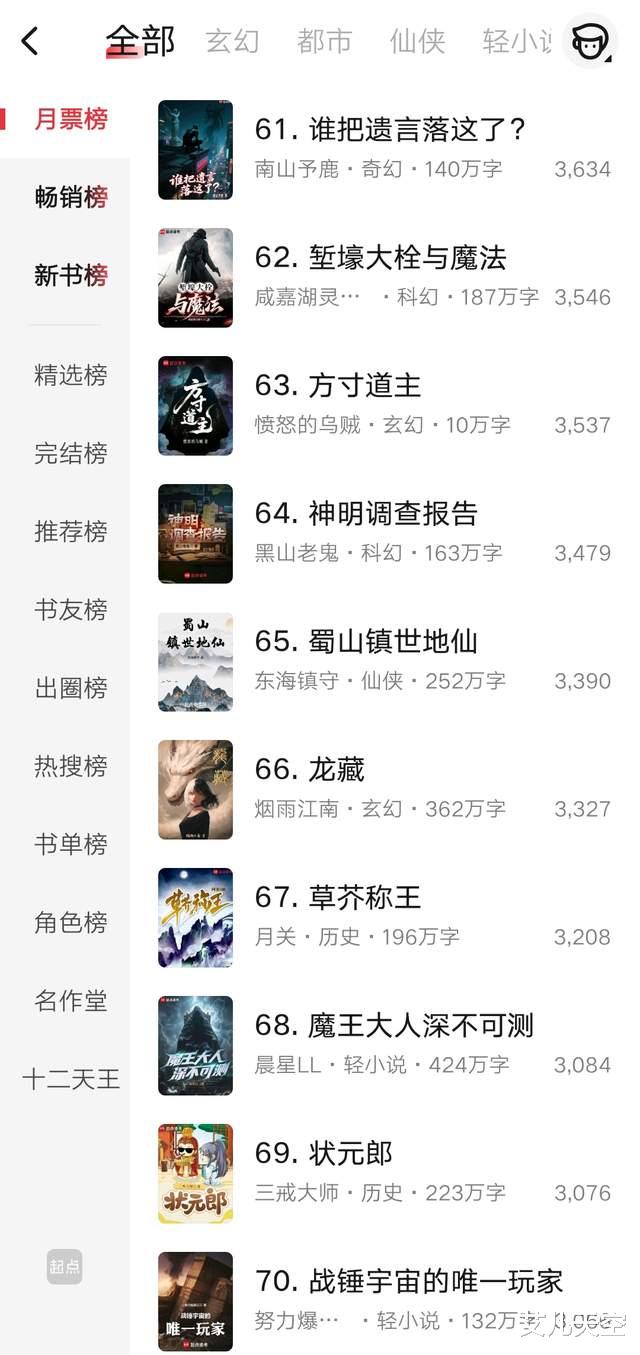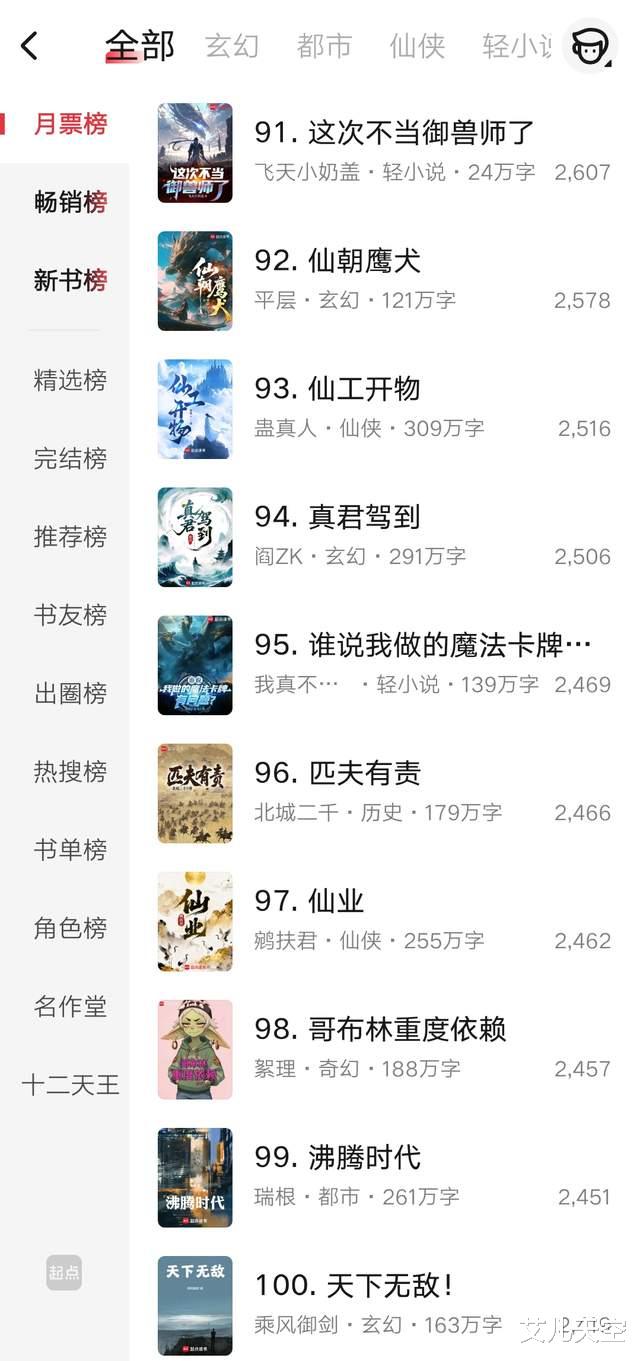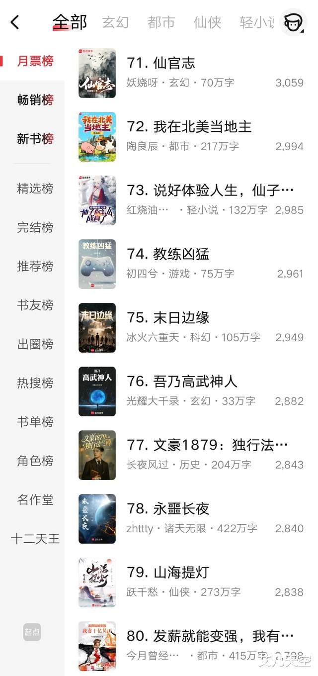 以上就是月票榜前百一些作品的排名情况了,也只是捡一些眼熟的说说。