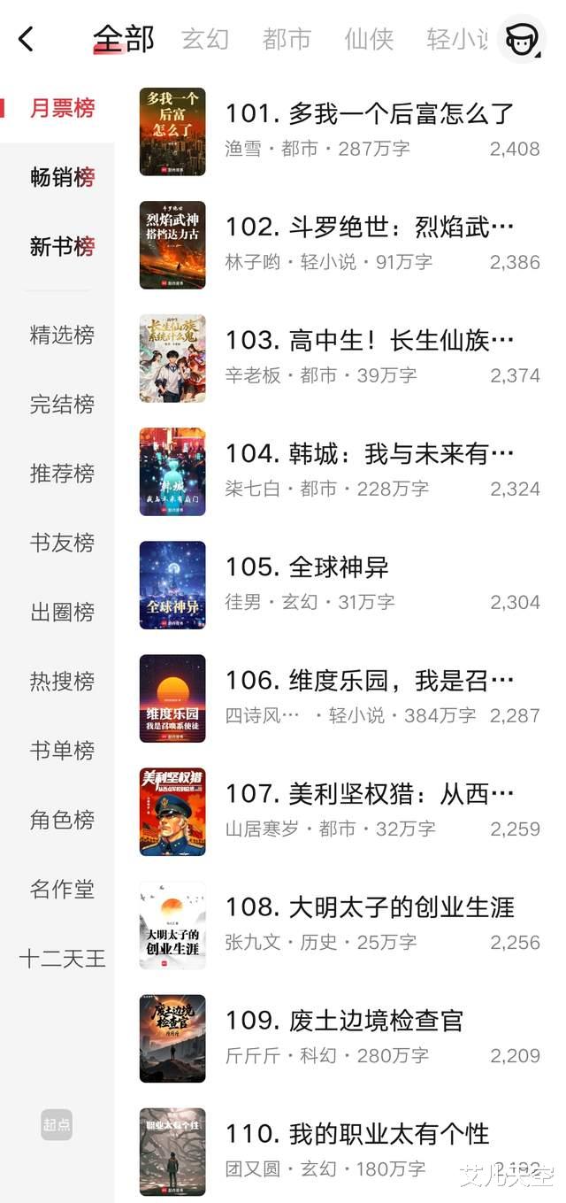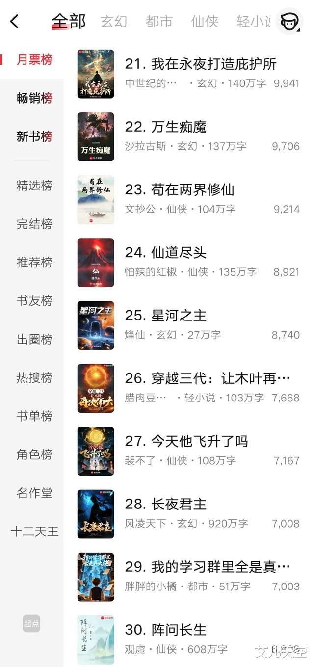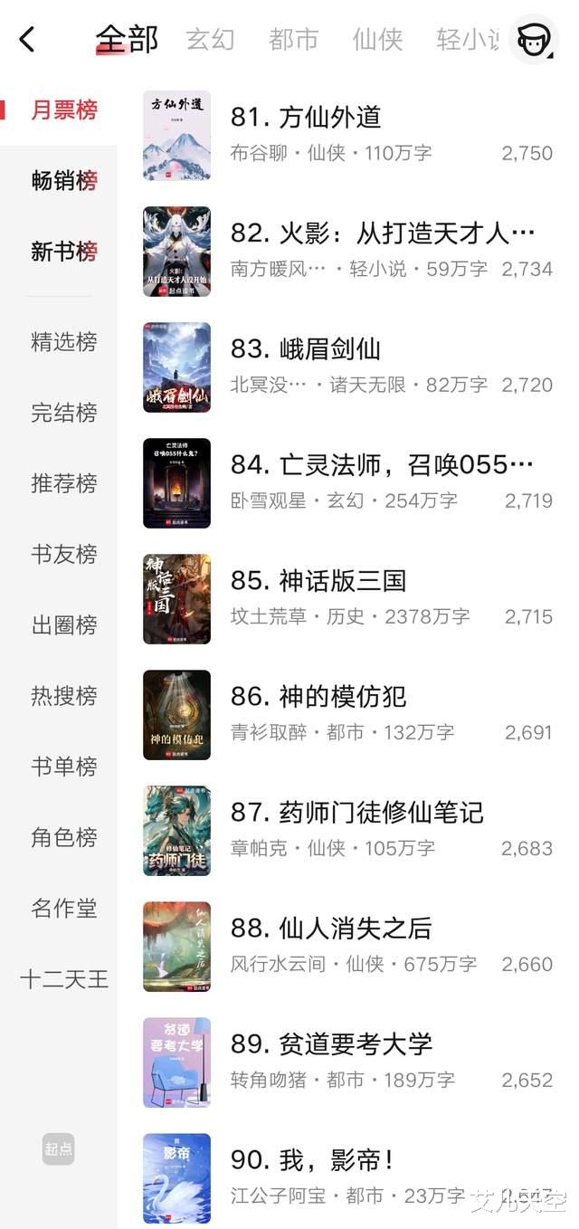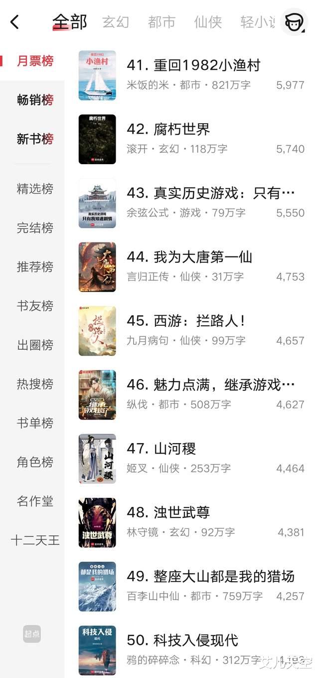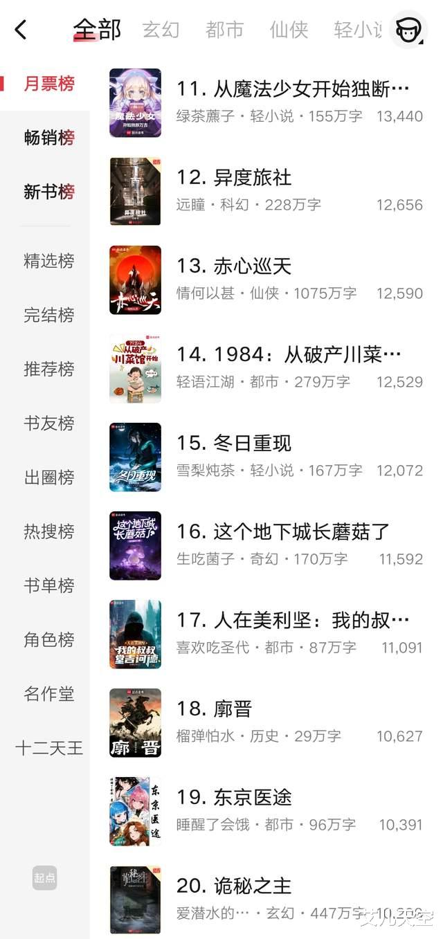以上就是月票榜前百一些作品的排名情况了,也只是捡一些眼熟的说说。