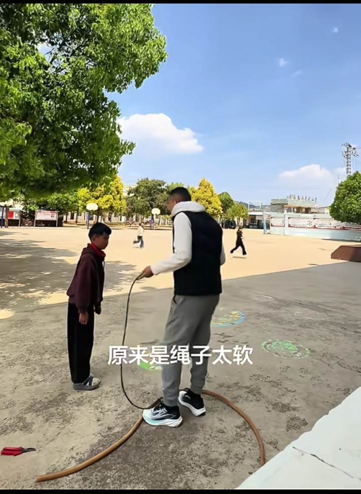 第二天中午,陆老师又把阳阳叫到操场单独练习,他发现问题就出在绳子上。普通的塑料绳太软,阳阳控制不好。于是,陆老师转身回去,找来一根废弃电线和一根塑料管替代,亲手给他做一根“专属跳绳”。这根又重又硬的绳子果然不一样,阳阳试着甩了几下就找到了感觉,接着,他顺利跳出了第一个,然后是第二个。那一刻,陆老师为他竖起大拇指。
