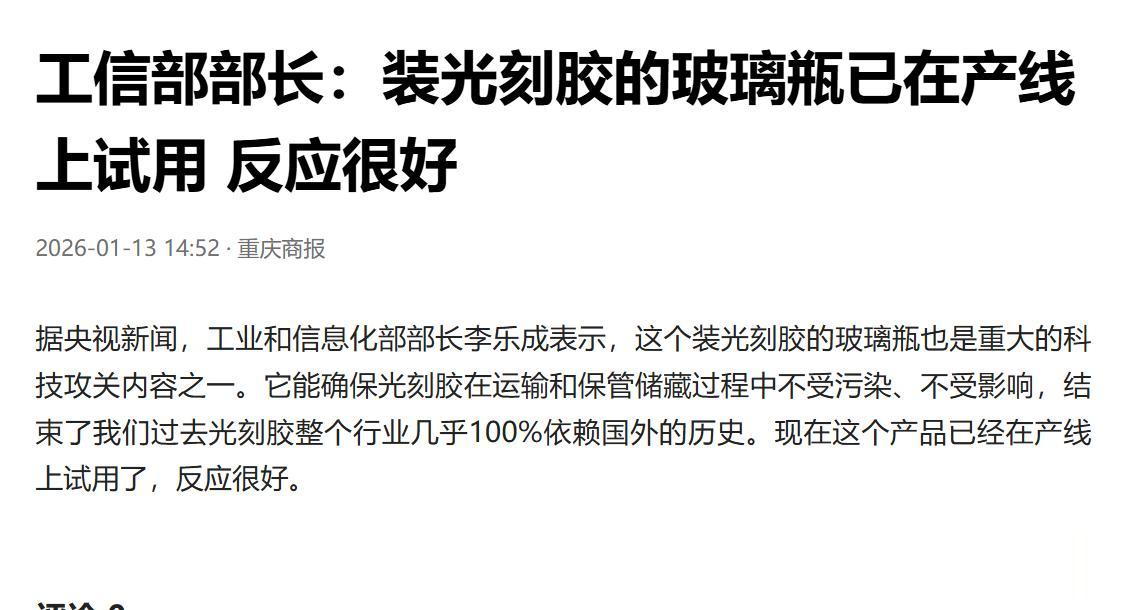 好消息!根据工信部最新消息,咱国产的光刻胶专用玻璃瓶已经在半导体产线用上了,反馈还很好。