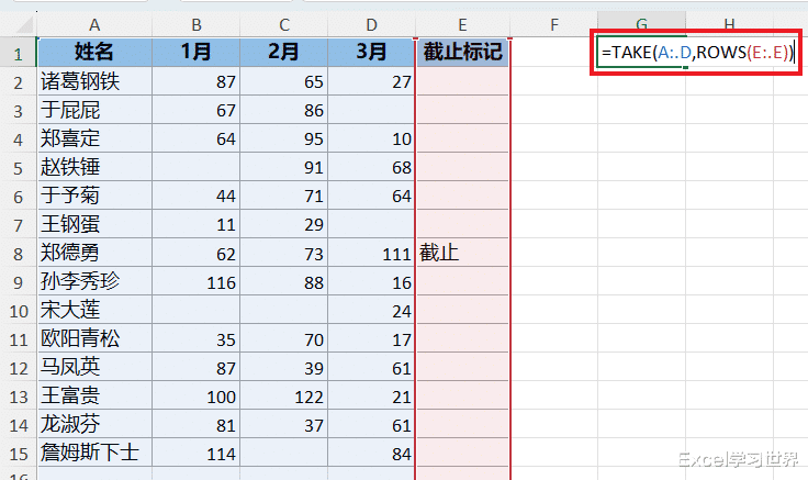 案例:下图 1 的 E 列有个截止标记,表示需要从 A 至 D 列中提取至标记所在的行。