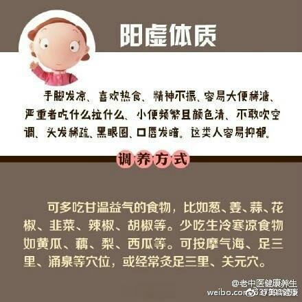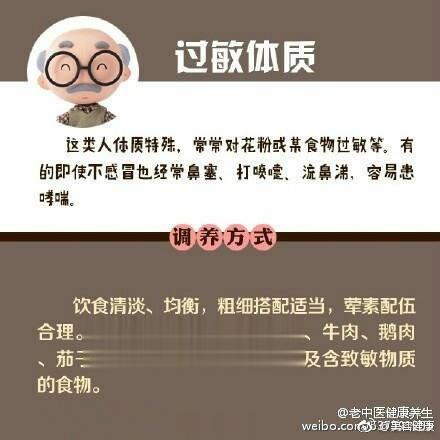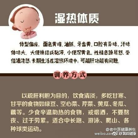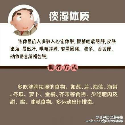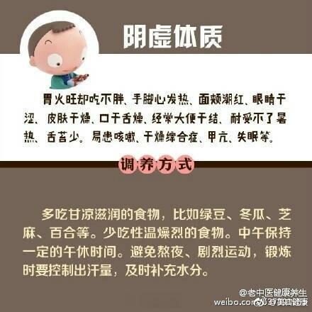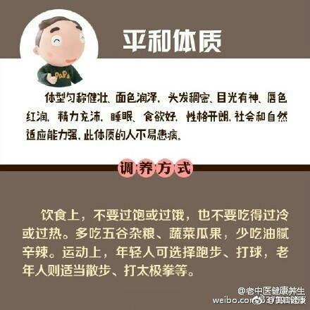 【中医上说的九种体质 及其调养方法】中医将人的体质分为九种类型:平和质、气虚质、阳虚质、阴虚质、痰湿质、湿热质、血瘀质、气郁质、特禀质。不同体质特点,有不同的养生方法。戳图↓↓自测一下,你属于哪一种?找到合适的调理方案吧,免得补错啦。