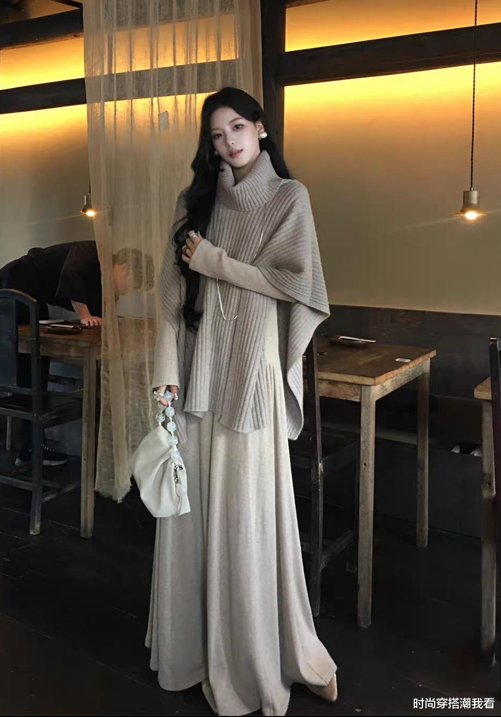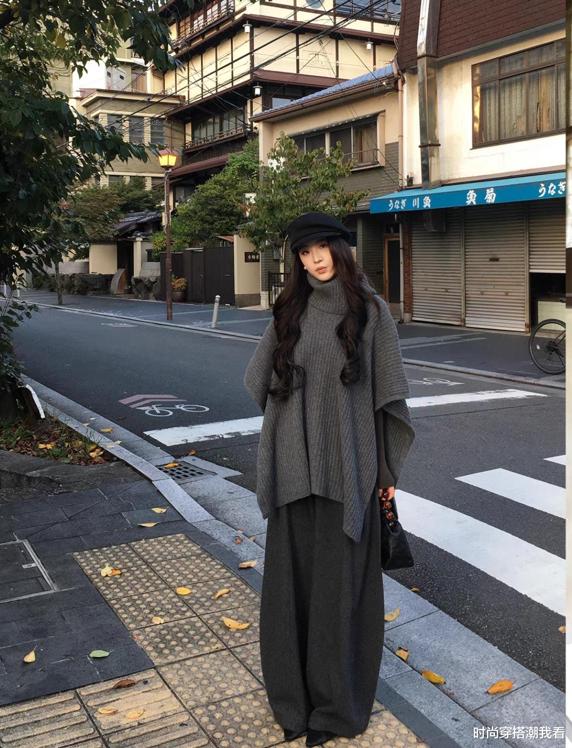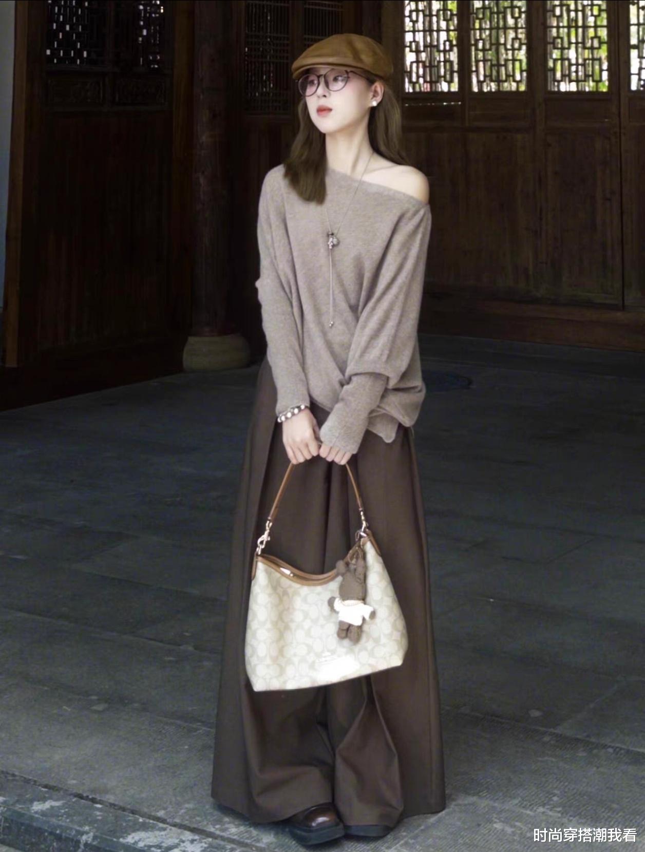 浅米色上衣配深棕色裤子,视觉重心下移,显得稳定端庄;深灰色毛衣配浅灰色直筒裤,视觉焦点上移,带来轻盈与灵动感。